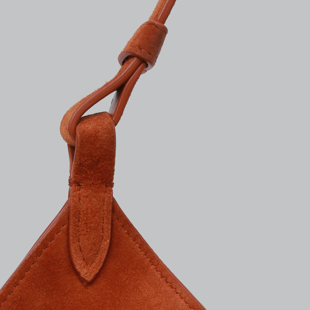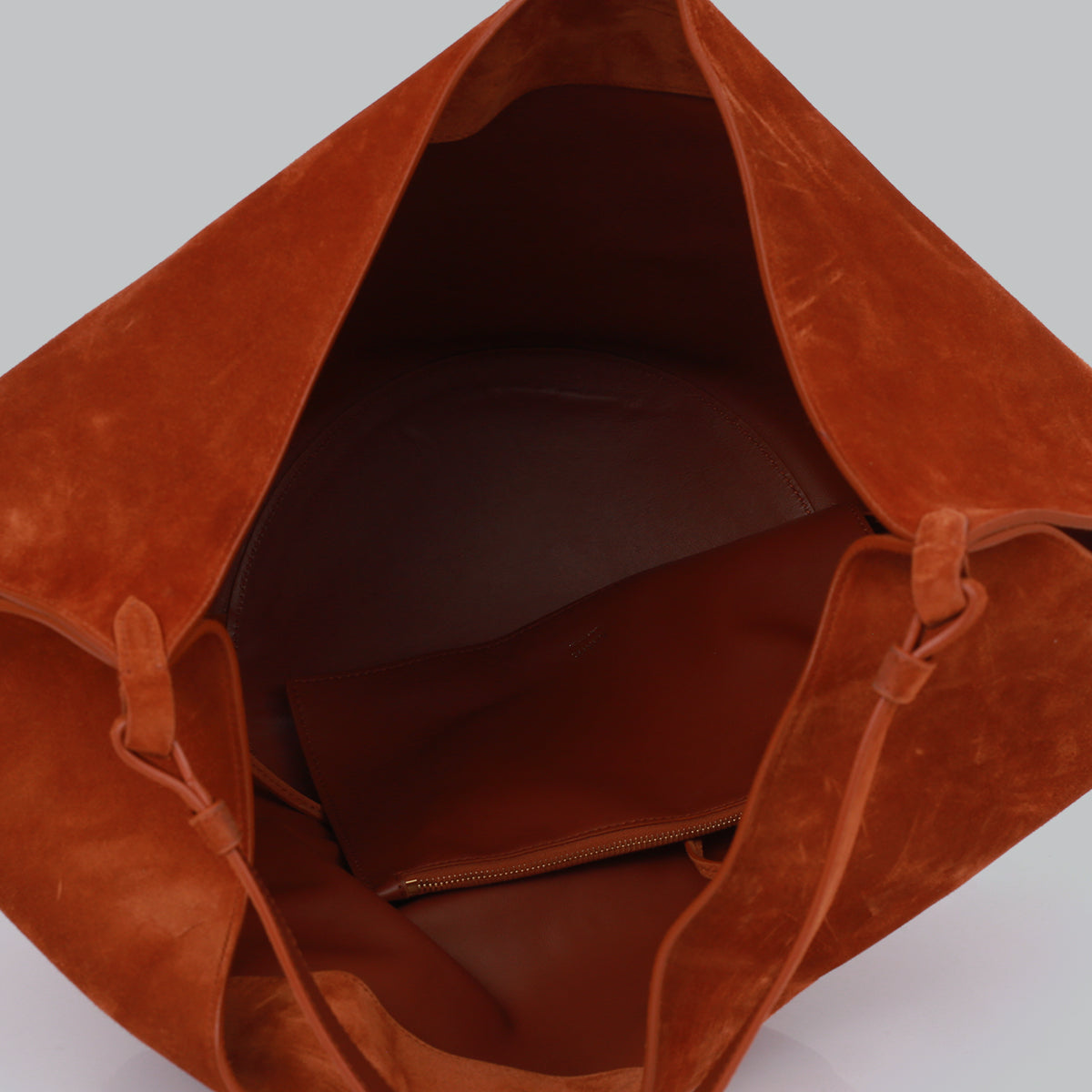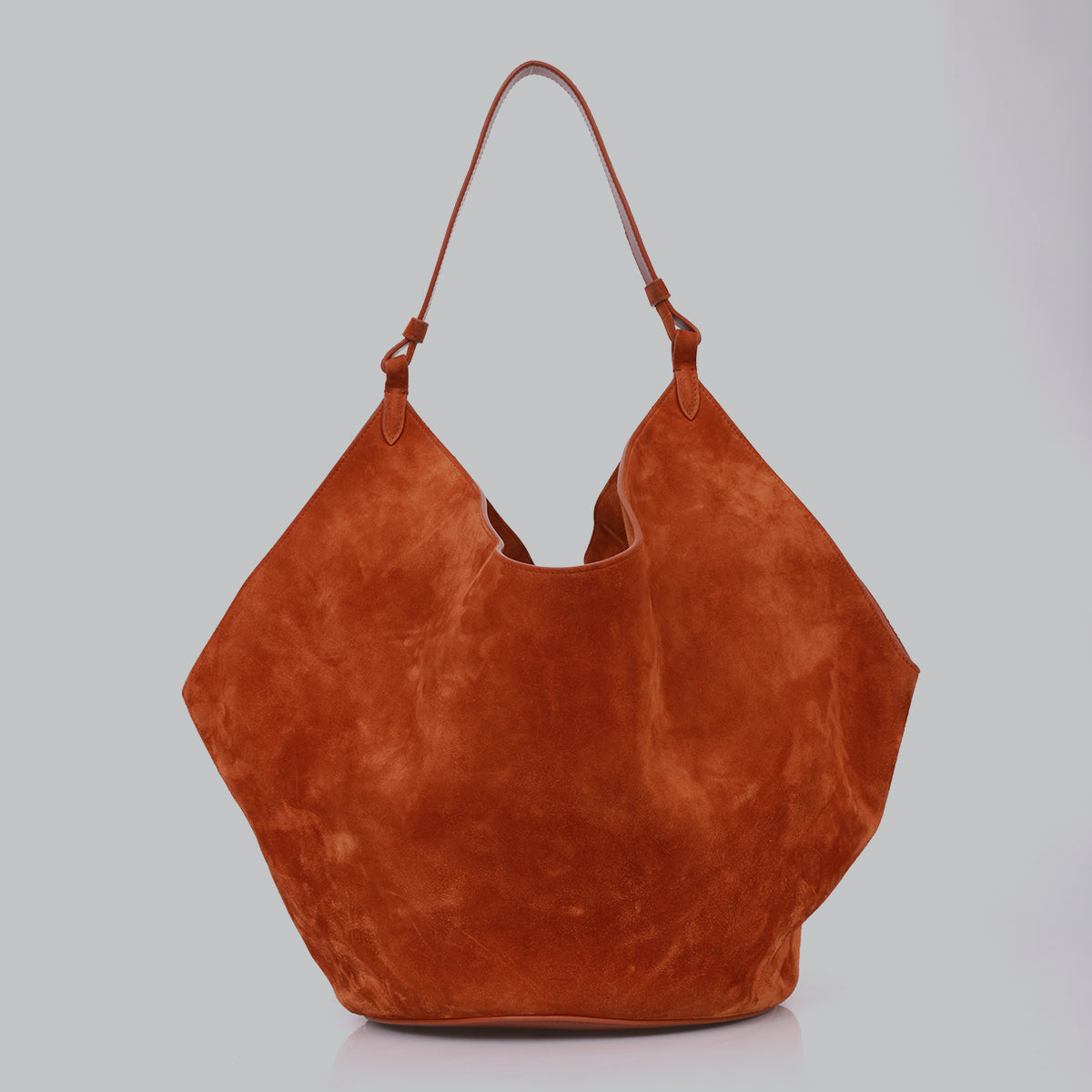 Detalhes: Bolsa Khaite confeccionada em camurça na cor caramelo. Modelo possui alça de ombro e base arredondada em couro. Compartimento interno amplo em couro na cor caramelo, com uma bolsinha no mesmo couro com fecho em zíper. Fechamento por amarração.