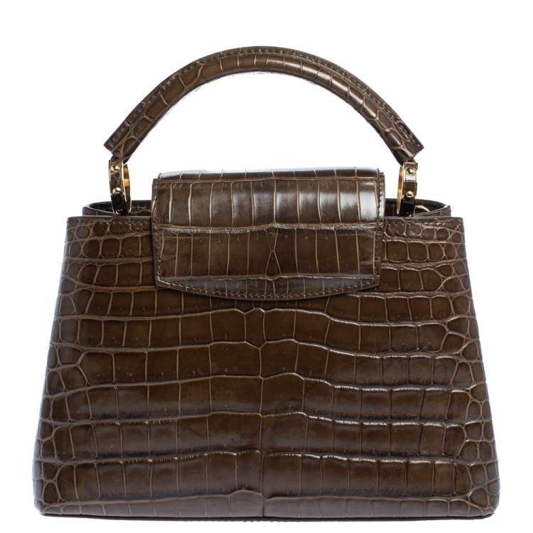 Detalhes: Bolsa Louis Vuitton confeccionada em couro de croco. A bolsa possui uma alça superior única para ser carregada na mão e uma alça removível para uso no ombro ou na transversal. O interior é forrado com couro de cabra e dividido em compartimentos, incluindo um bolso com zíper, apresenta a aba superior que pode ser usada por dentro ou por fora, revelando o logotipo "LV" ou o emblema em formato de V. A bolsa é finalizada com ferragens douradas.