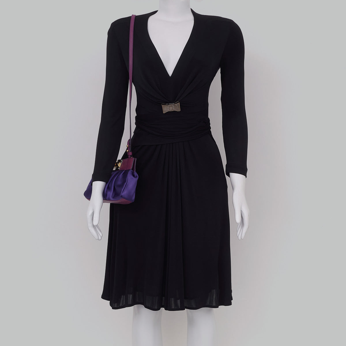 Estado da peça: Usada, em ótimo estado. Apresenta ferragens com riscos e manchas, couro com riscos e cetim roxo com leves desgastes.