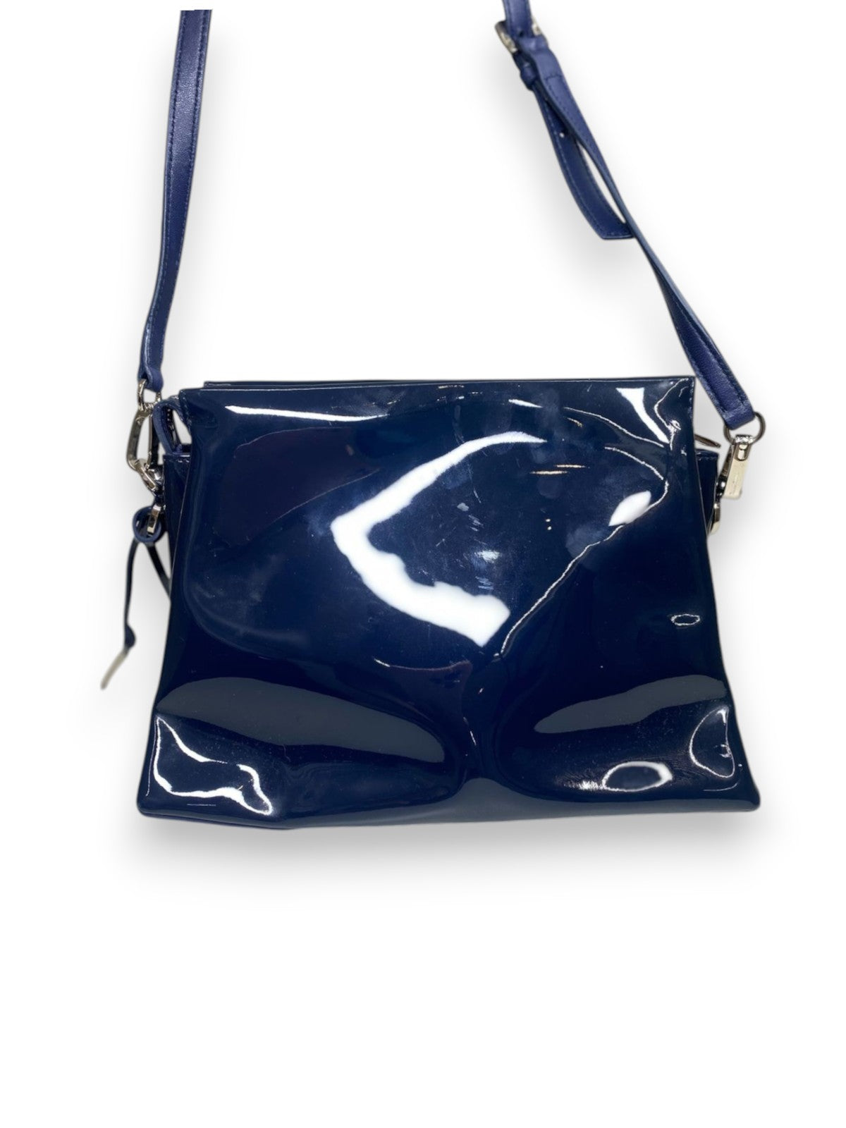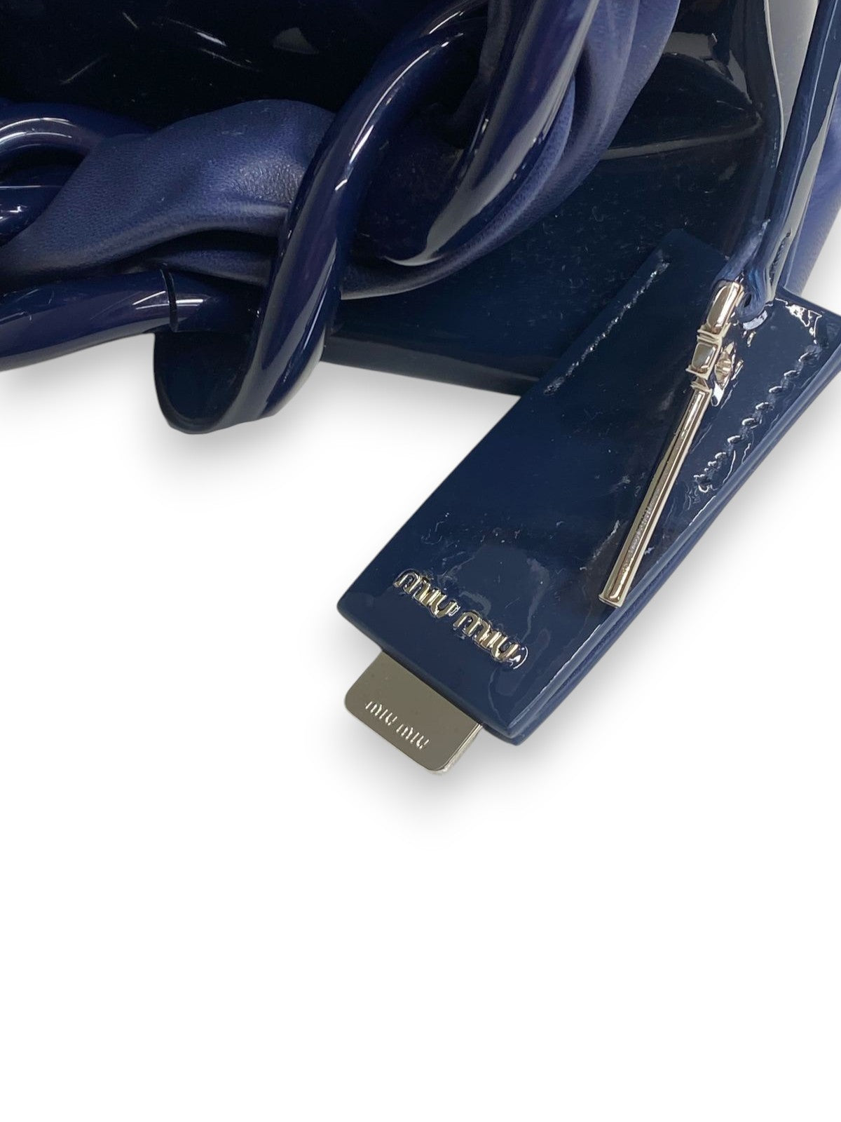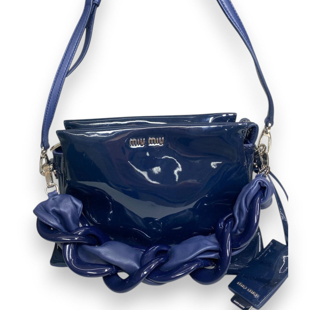 Detalhes: Bolsa Miu Miu em vinil na cor azul marinho. Bolsa possui alça de mão em couro com corrente de plástico emm volta. Acompanha alça crossbody e fechamento em zíper.