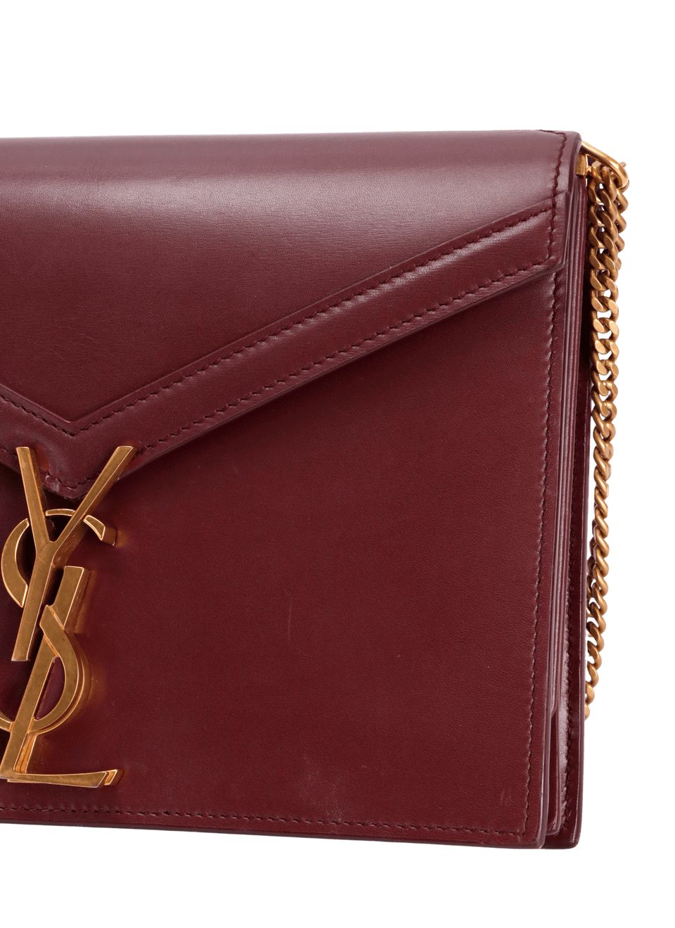 Detalhes: Bolsa Saint Laurent na cor vinho, confeccionada em couro. A bolsa possui uma aba em formato de envelope, com a borda de aba realçada por uma costura em V. A alça possui corrente dupla deslizante, dois compartimentos, um bolso aberto e um com fecho por zíper. A bolsa possui fecho por pressão com a logotipo YSL.