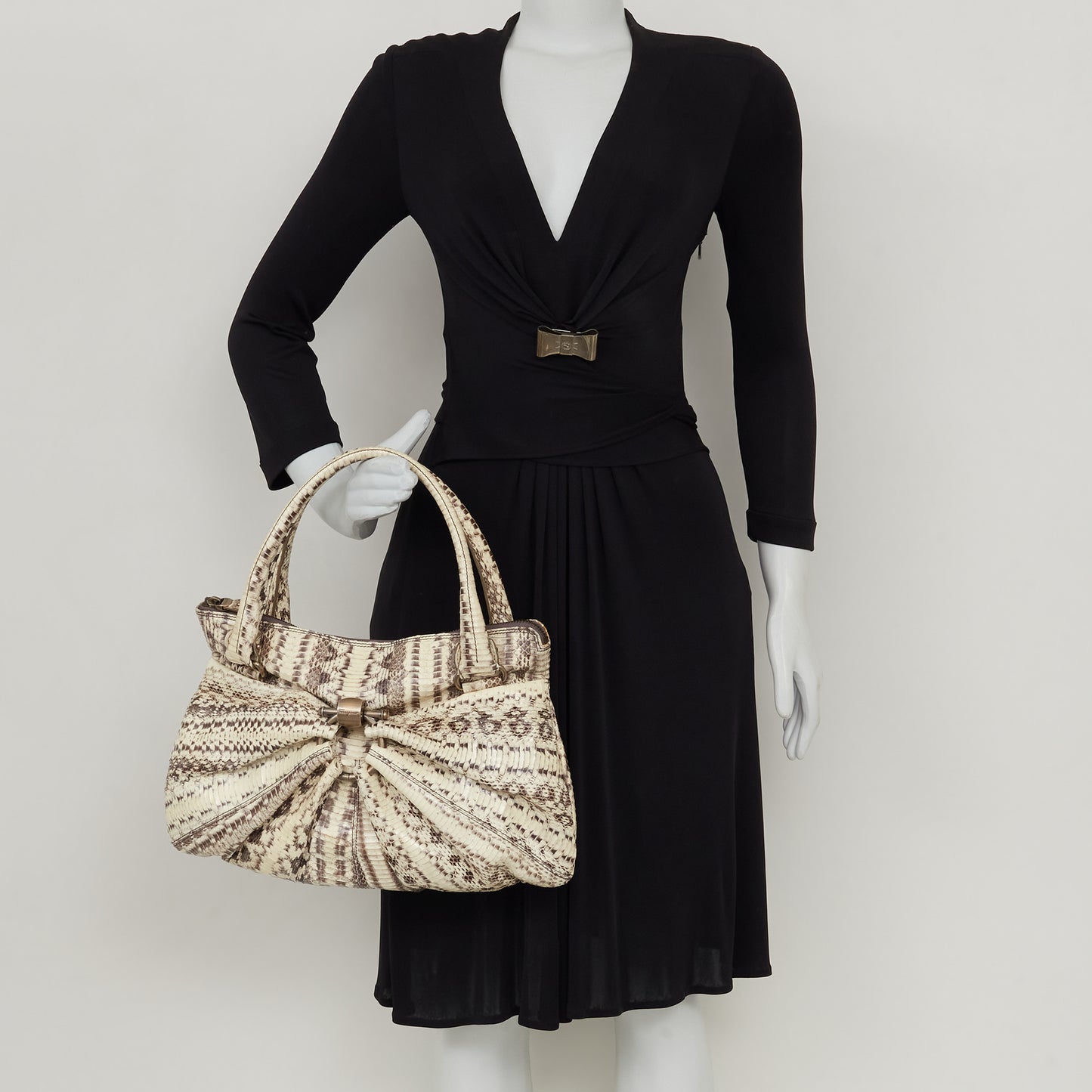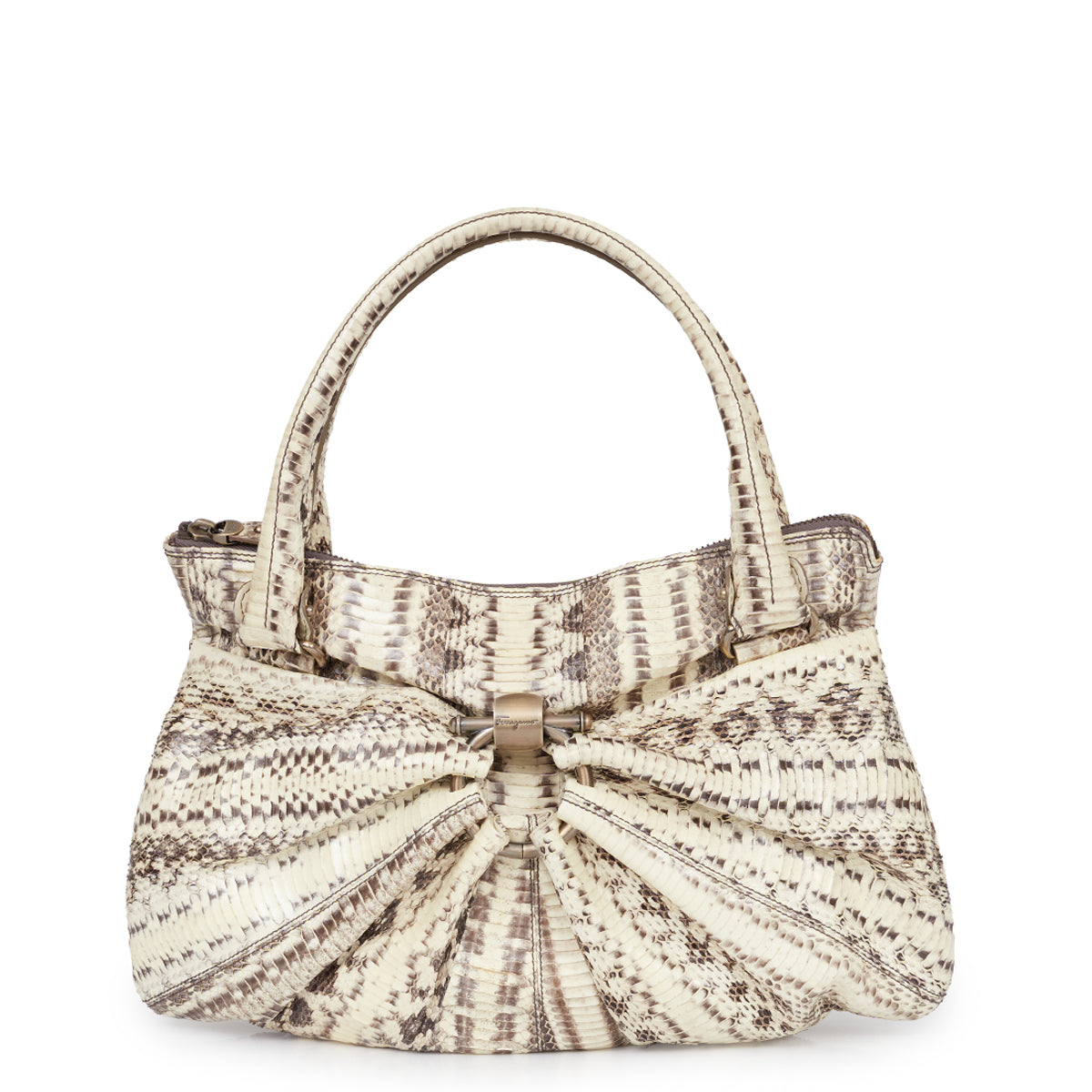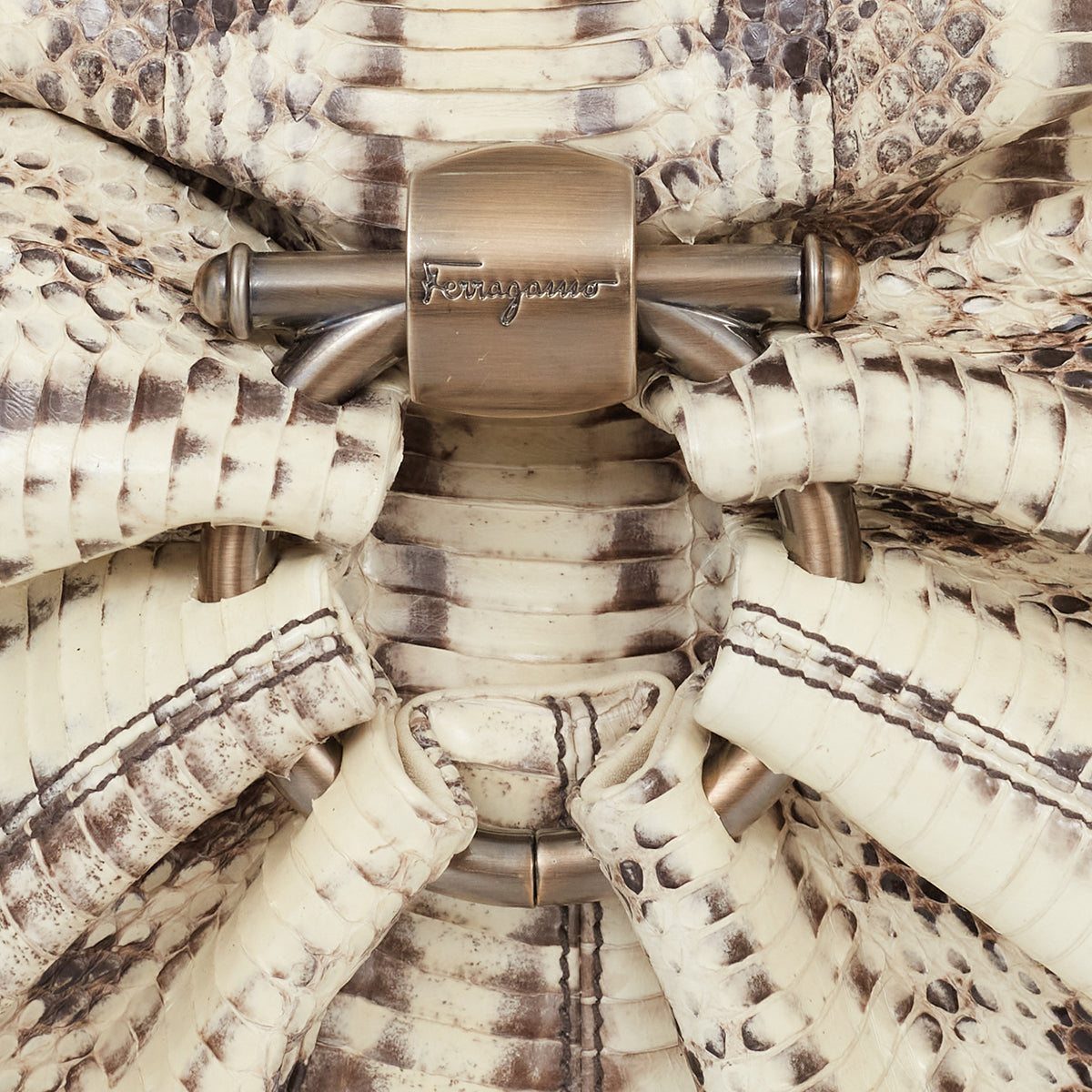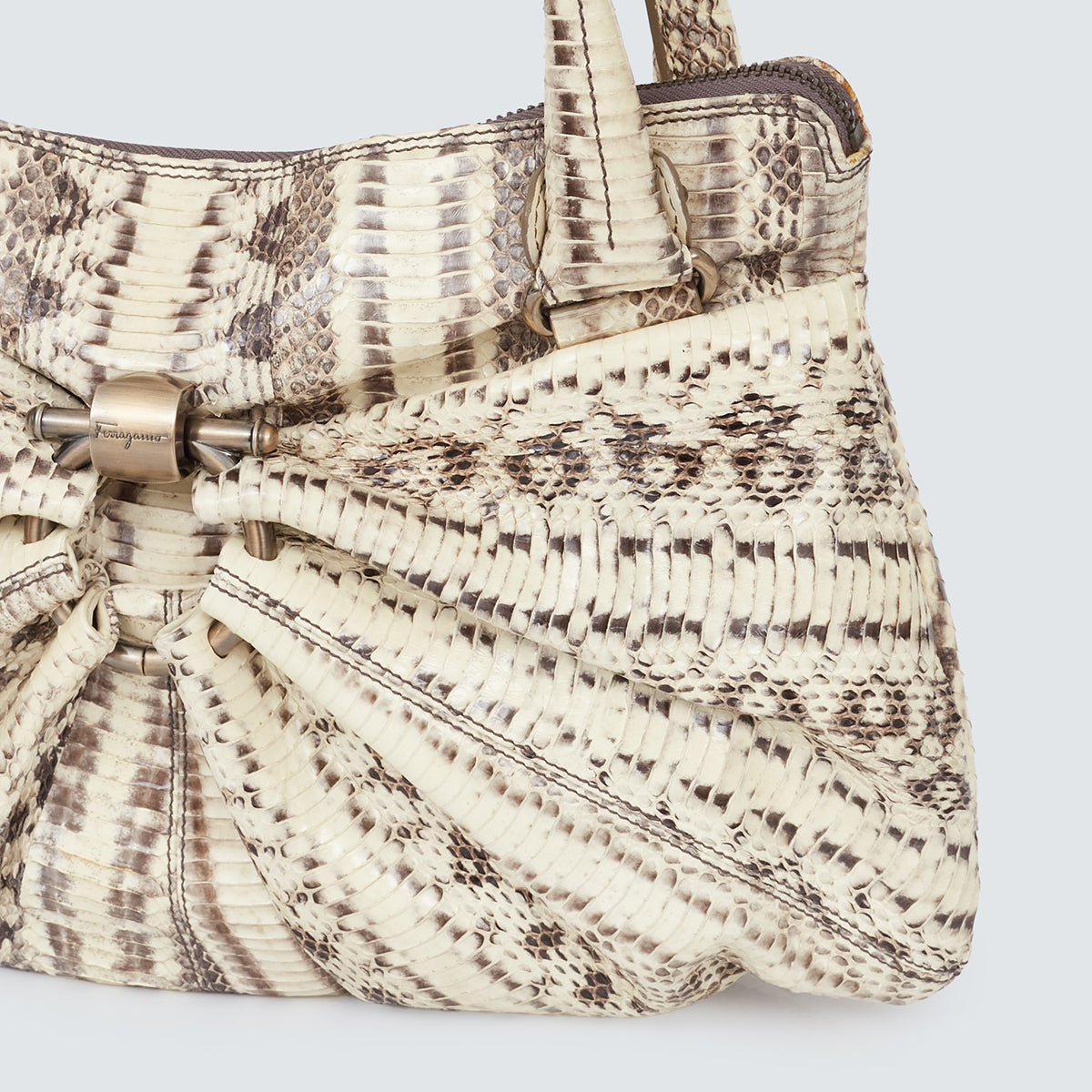 Detalhes: Bolsa Salvatore Ferragamo Python, confeccionada em couro pytho na cor off-white. Modelo apresenta forma sacola, alça de ombro, bolso interno com fecho em zíper e fechamento externo por zíper. Forro em suede. Acompanha dust da marca.