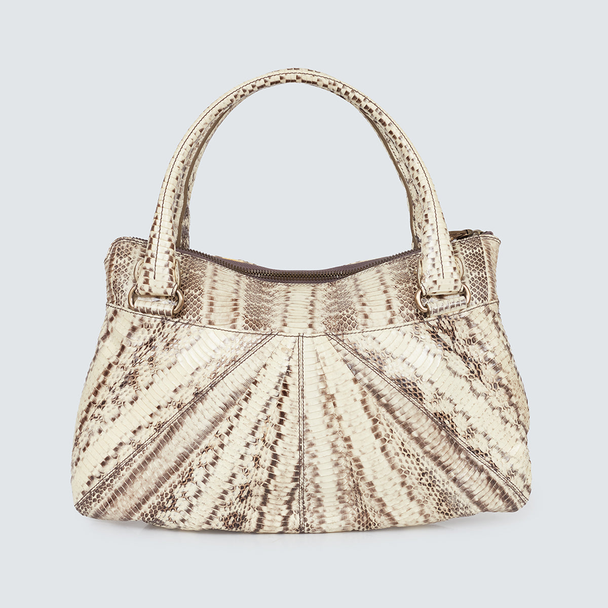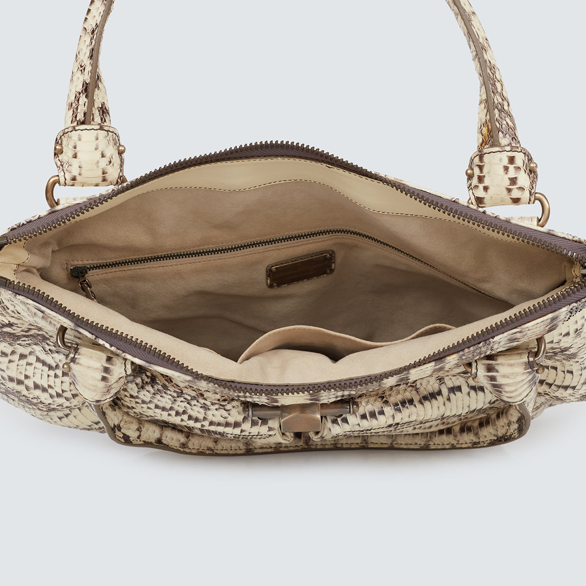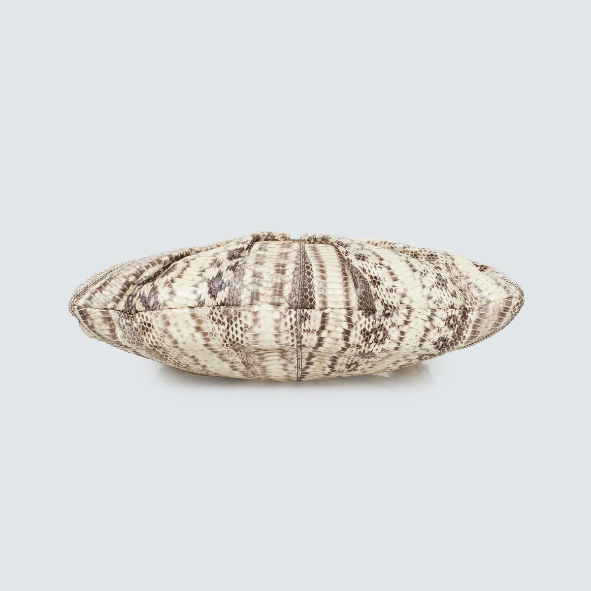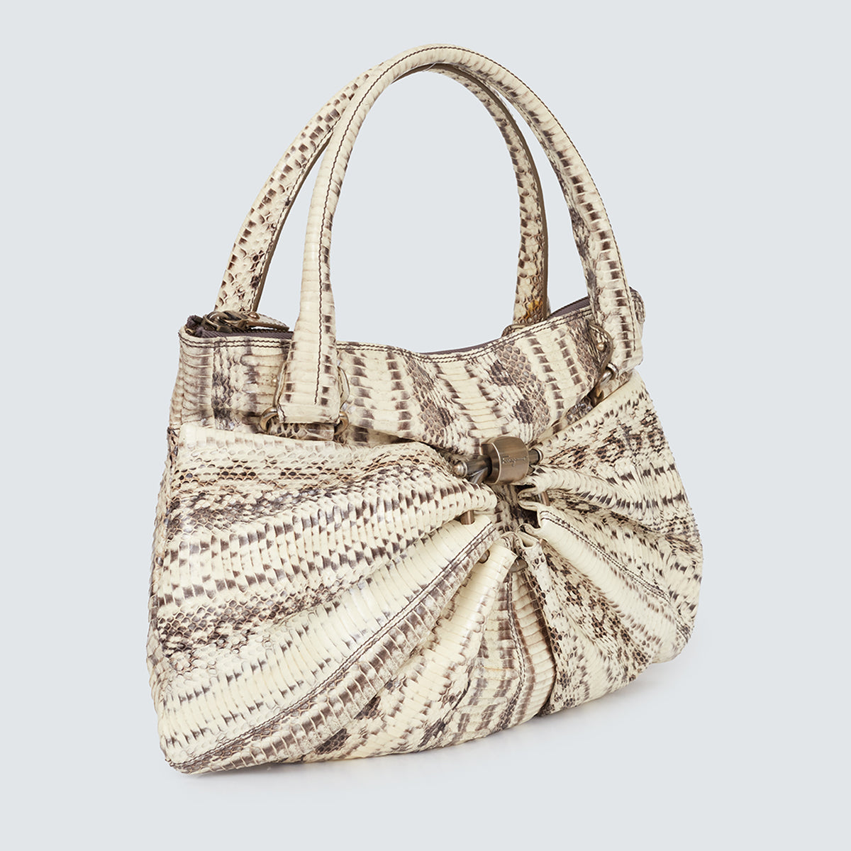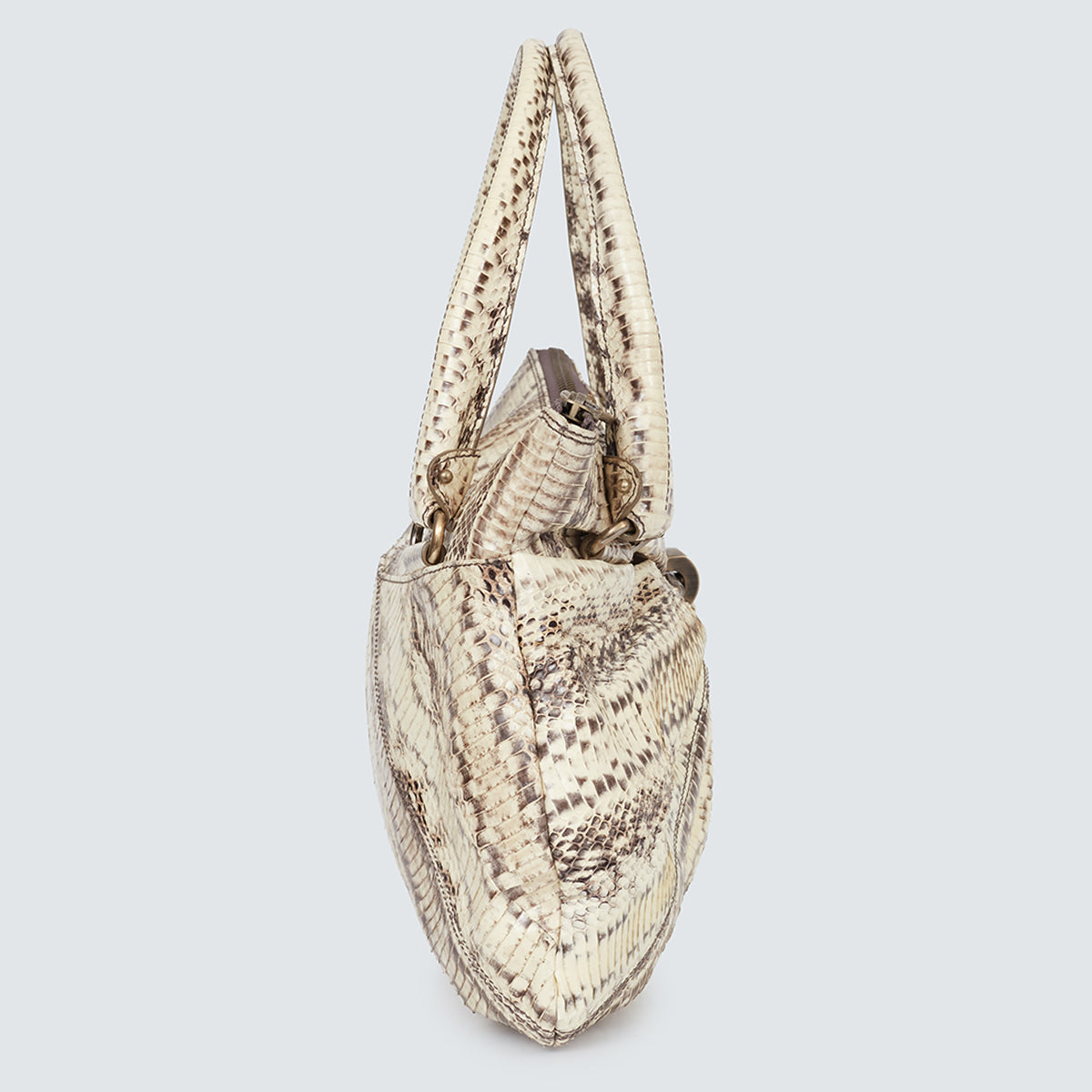 Detalhes: Bolsa Salvatore Ferragamo Python, confeccionada em couro pytho na cor off-white. Modelo apresenta forma sacola, alça de ombro, bolso interno com fecho em zíper e fechamento externo por zíper. Forro em suede. Acompanha dust da marca.