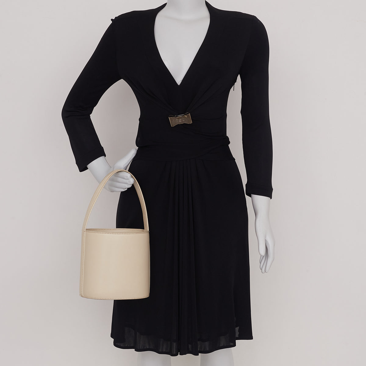 Detalhes: Bolsa Staud confeccionada em couro na cor off-white com ferragens internas na cor dourada. Em formato "bucket" ou "balde", com alça estruturada de mão. Parte interna em tecido suede na cor gelo com placa em couro com nome da marca.