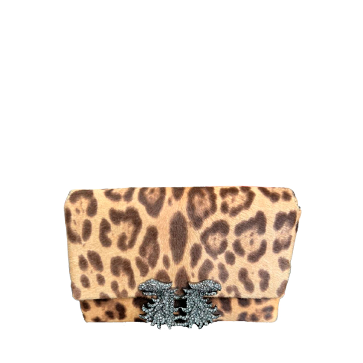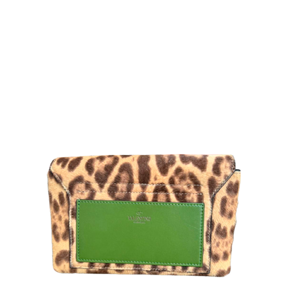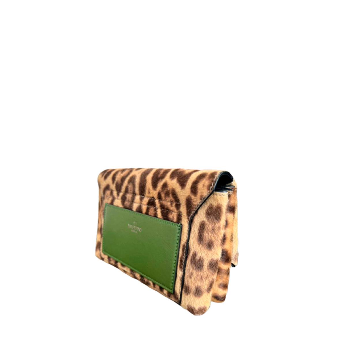 Detalhes: Bolsa Valentino com estampa de onça e detalhe de brilhante na parte frontal. Possui detalhe verde com nome da marca na parte traseira e alça verde comprida de couro.