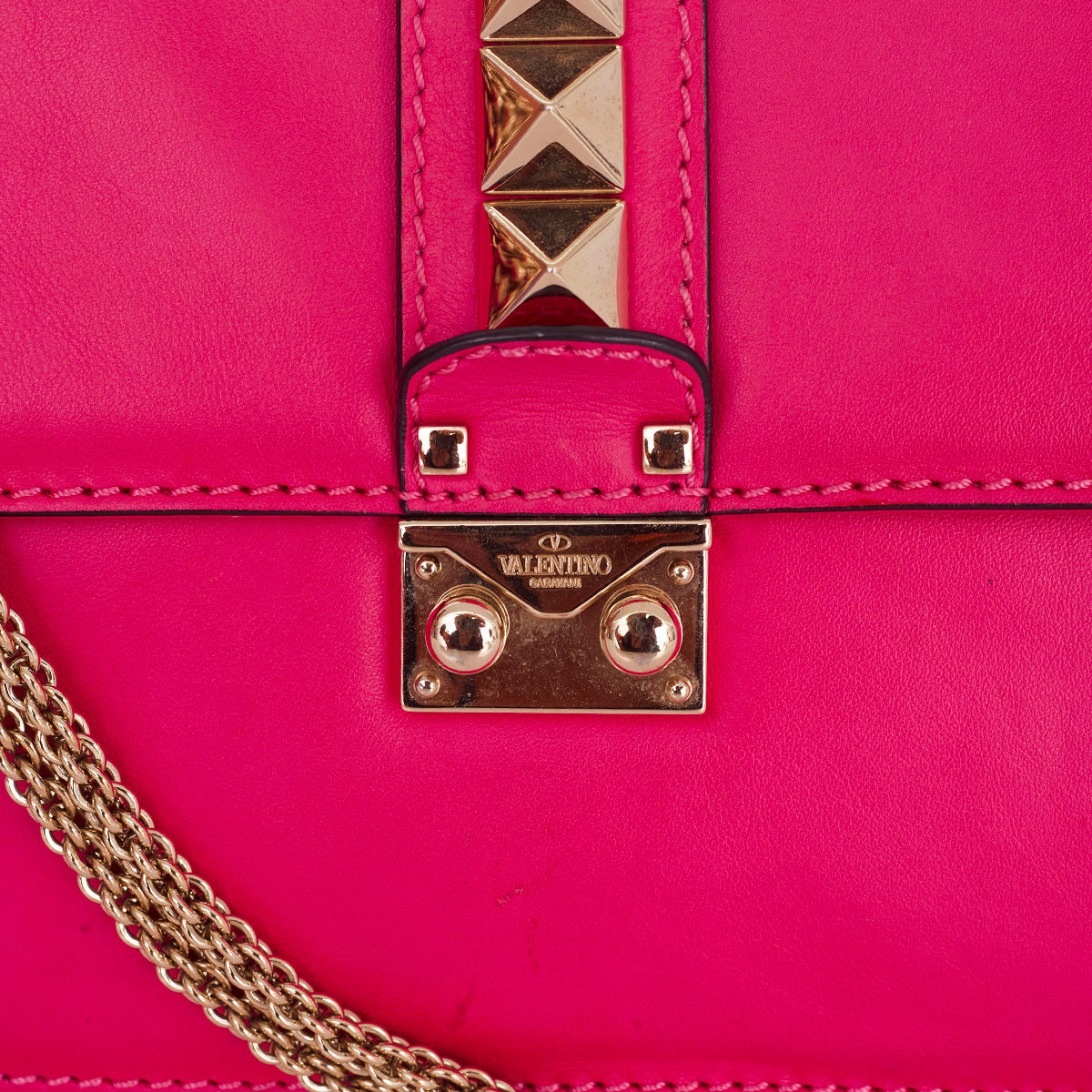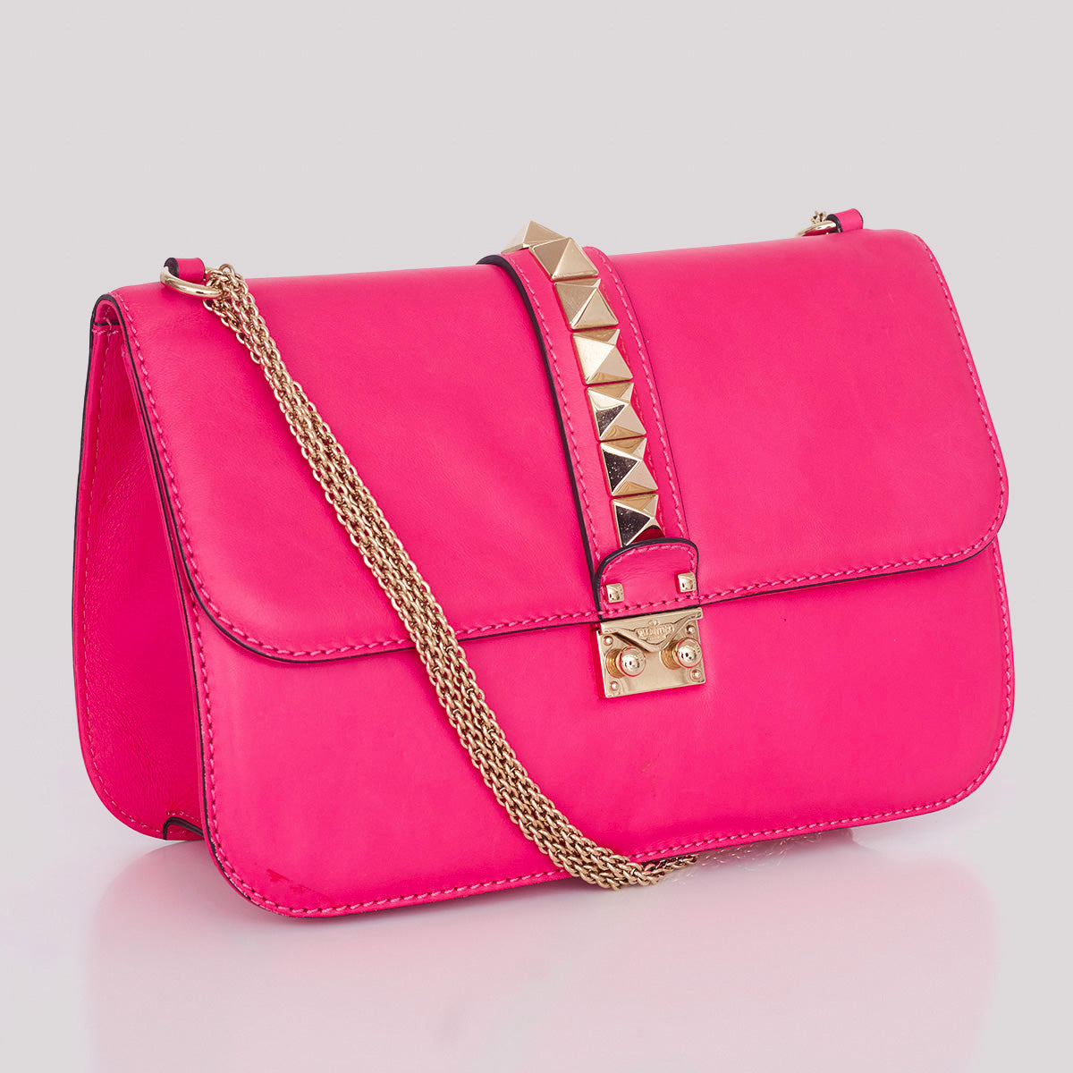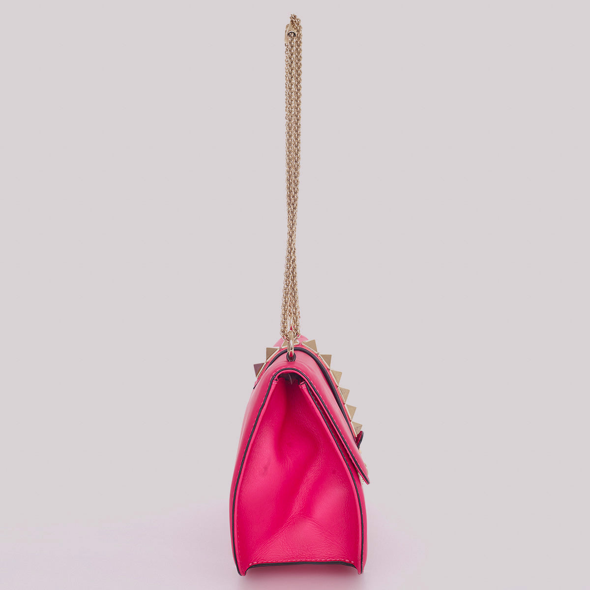 Detalhes: Bolsa Valentino confeccionada em couro na cor rosa. Possui detalhe de studs dourados e alça em corrente ajustavel. Parte interna em tecido com compartimento único com bolsos. Fecho em encaixe.