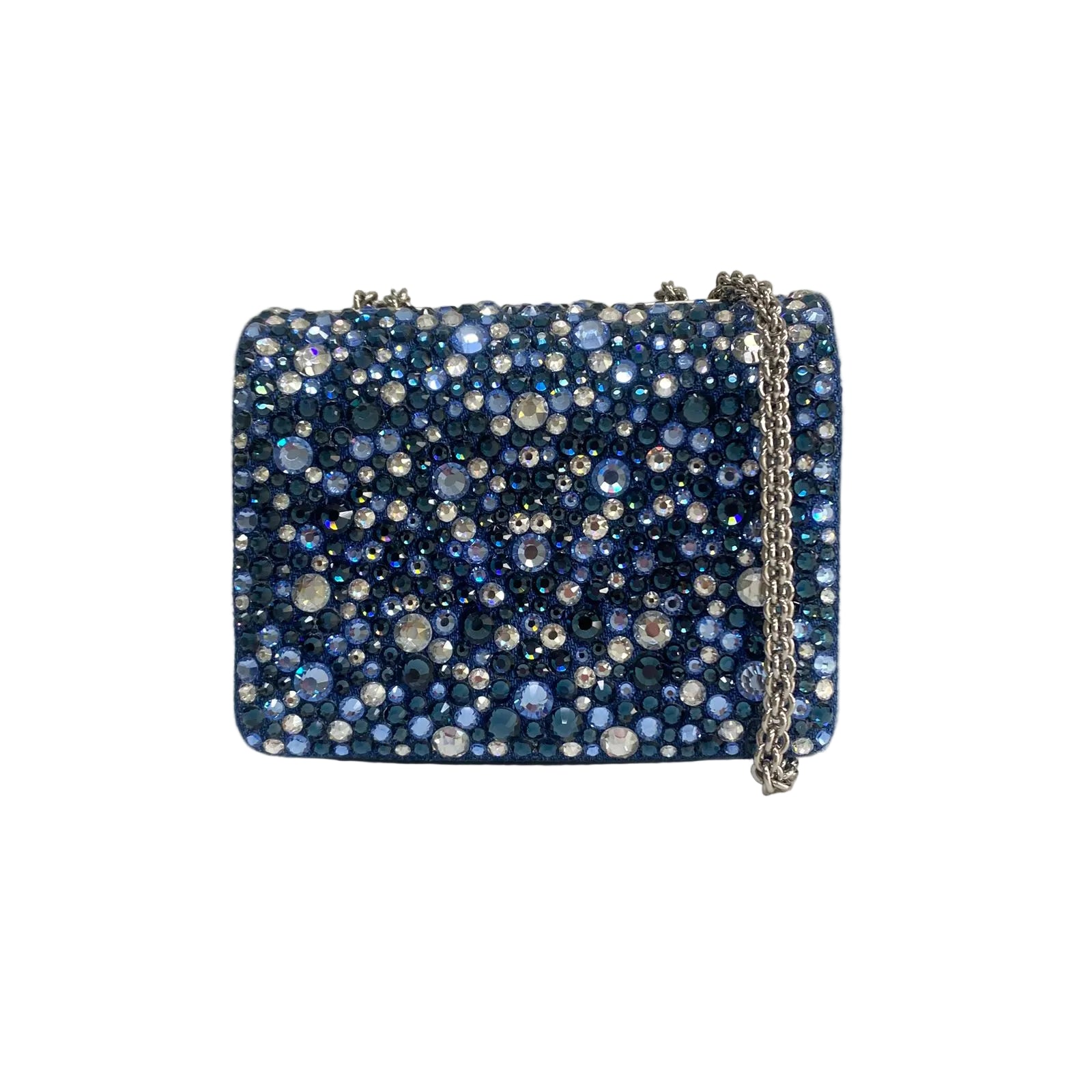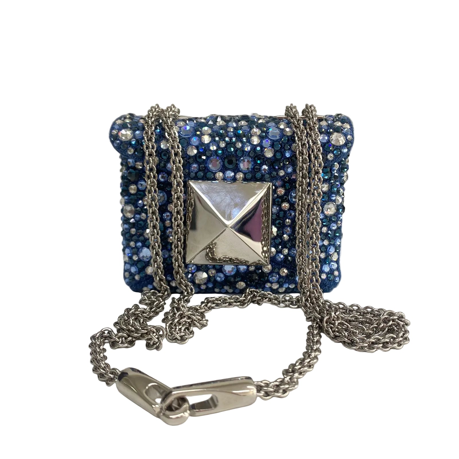 Detalhes: Bolsa Valentino confeccionada em jeans com detalhe de pedraria em toda a parte de fora da bolsa, parte interna em couro na cor azul. Alça ajustável em dois tamanhos em ferragens pratas. Fecho por imã na parte frontal.