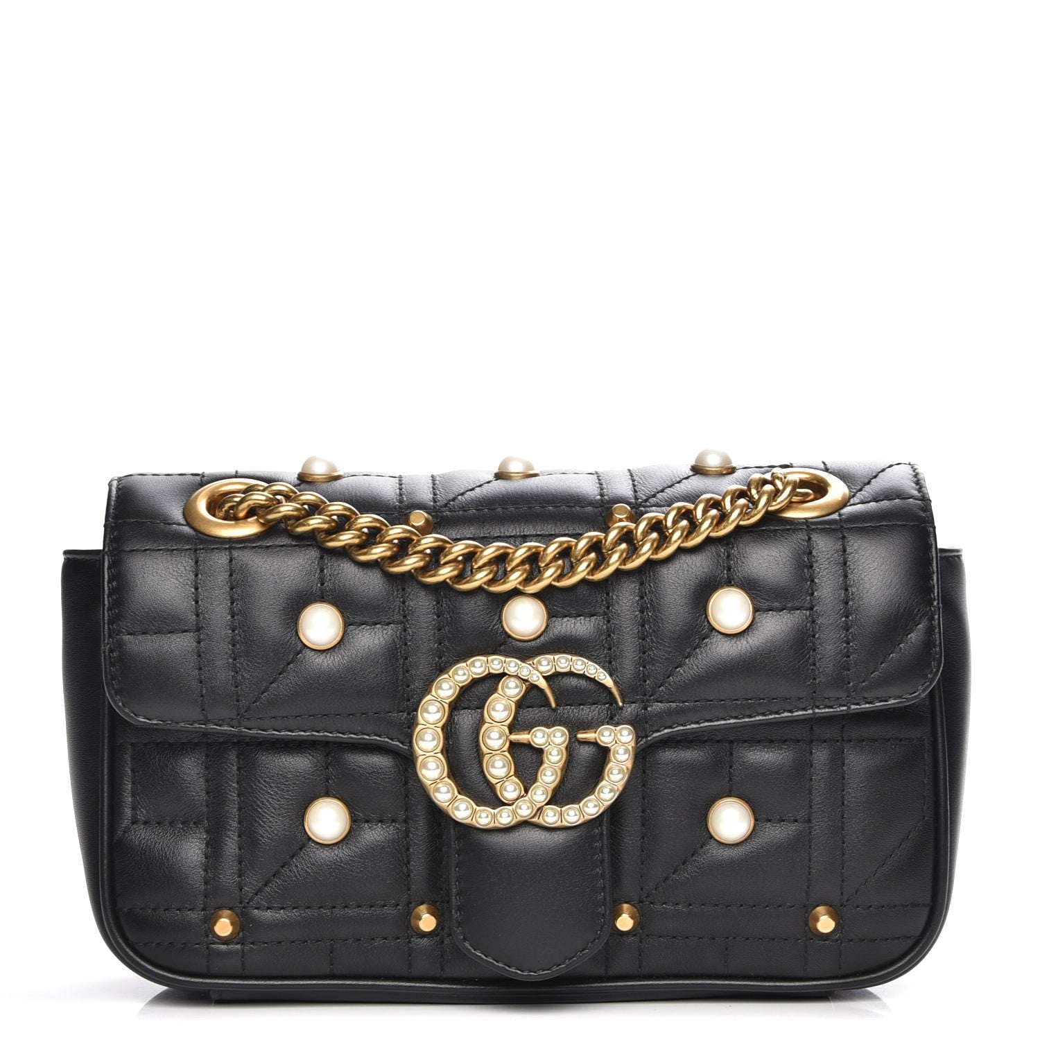 Detalhes: Bolsa Gucci Marmont confeccionada em couro na cor preta. Modelo possui textura matelassê, com aplicações em perolas, alça de ombro, aba superior dobrável e GG em metal com perolas. Parte interna em camurça nude, com compartimento único e um bolso, com zíper. Ferragens douradas. Fechamento por encaixe.