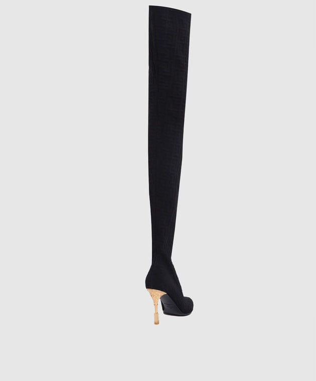 Detalhes: Bota Balmain confeccionada em tecido na cor preto. Possui cano alto/ acima do joelho, salto alto e fino trabalhado com o logo da marca em dourado, bico fino e detalhe de logo por todo comprimento.