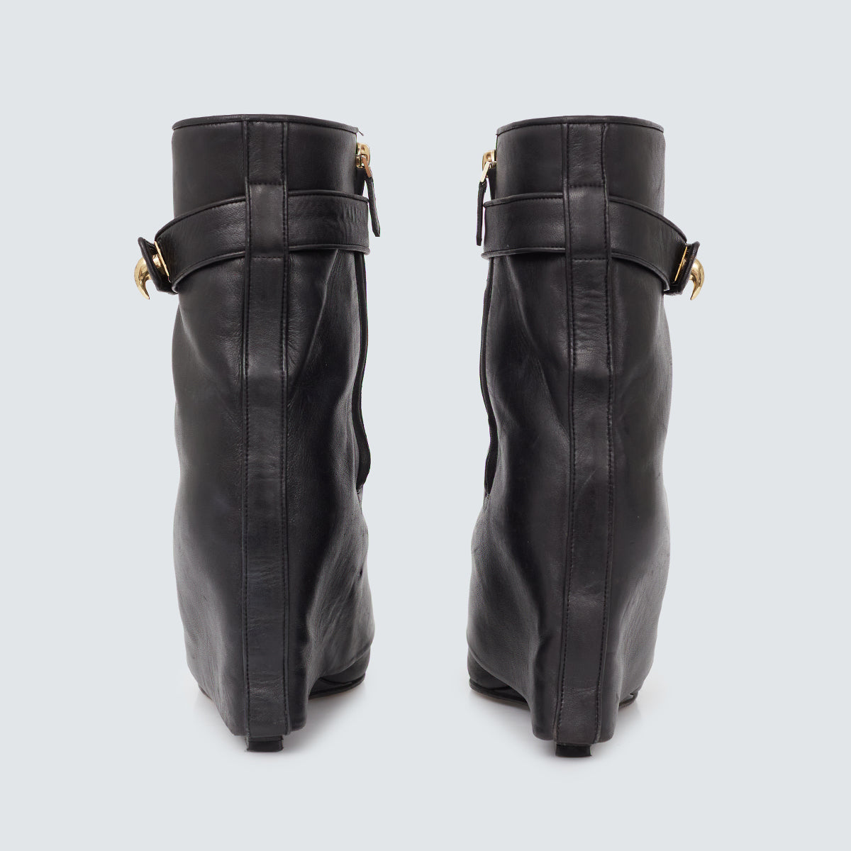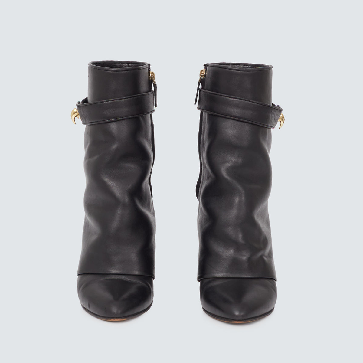Detalhes: Bota de bico levemente fino, salta alto. Fecho em zíper lateral. Possui fivela dourada e sobreposição de couro.