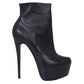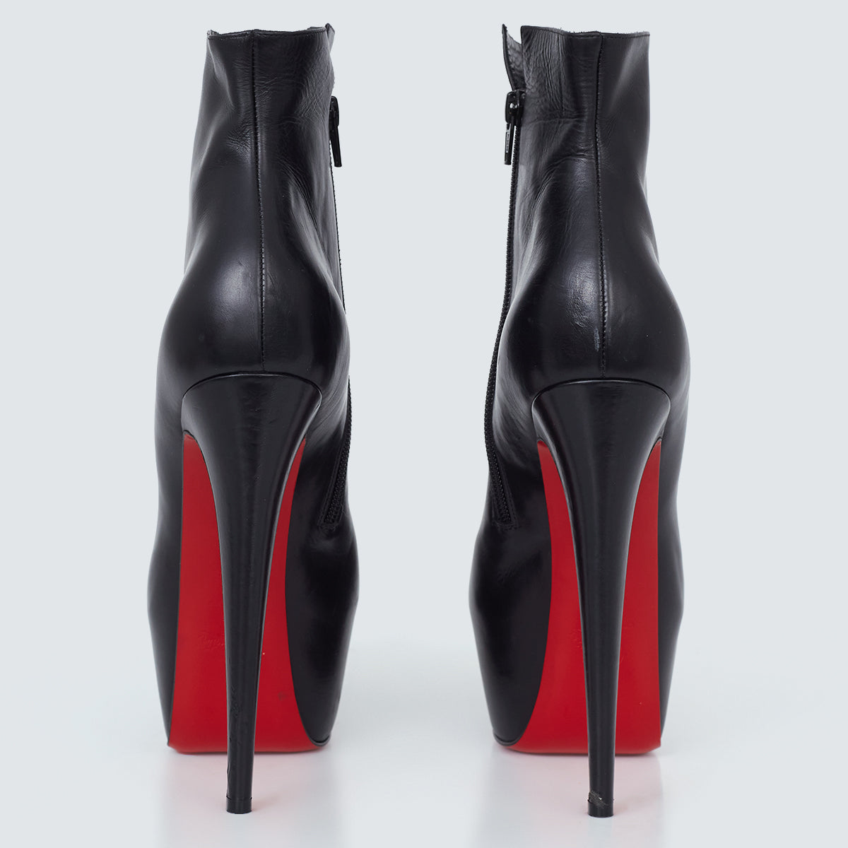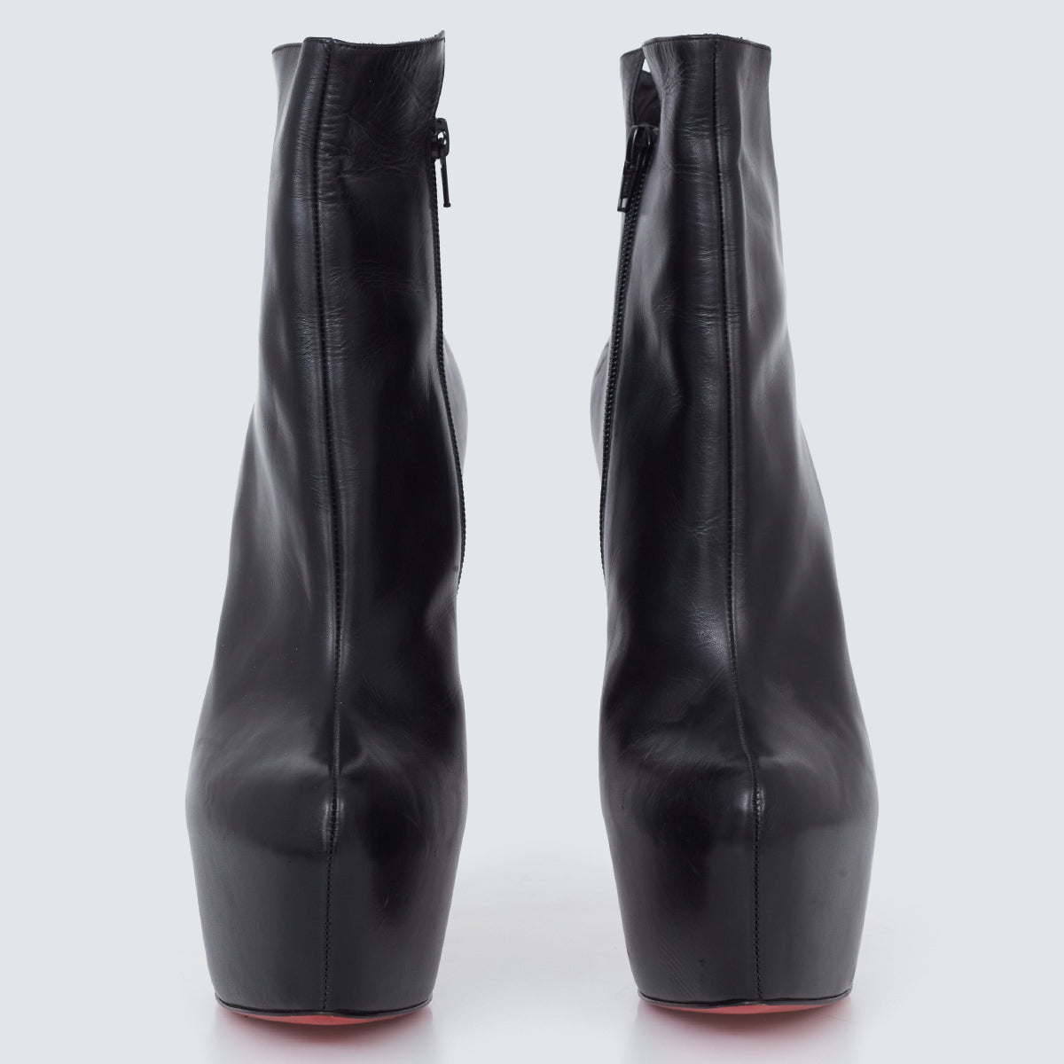 Detalhes: Bota Louboutin confeccionada em couro na cor preta. Modelo possui bico redondo alongado, cano curto, salto alto fino, plataforma e zíper na lateral interna.