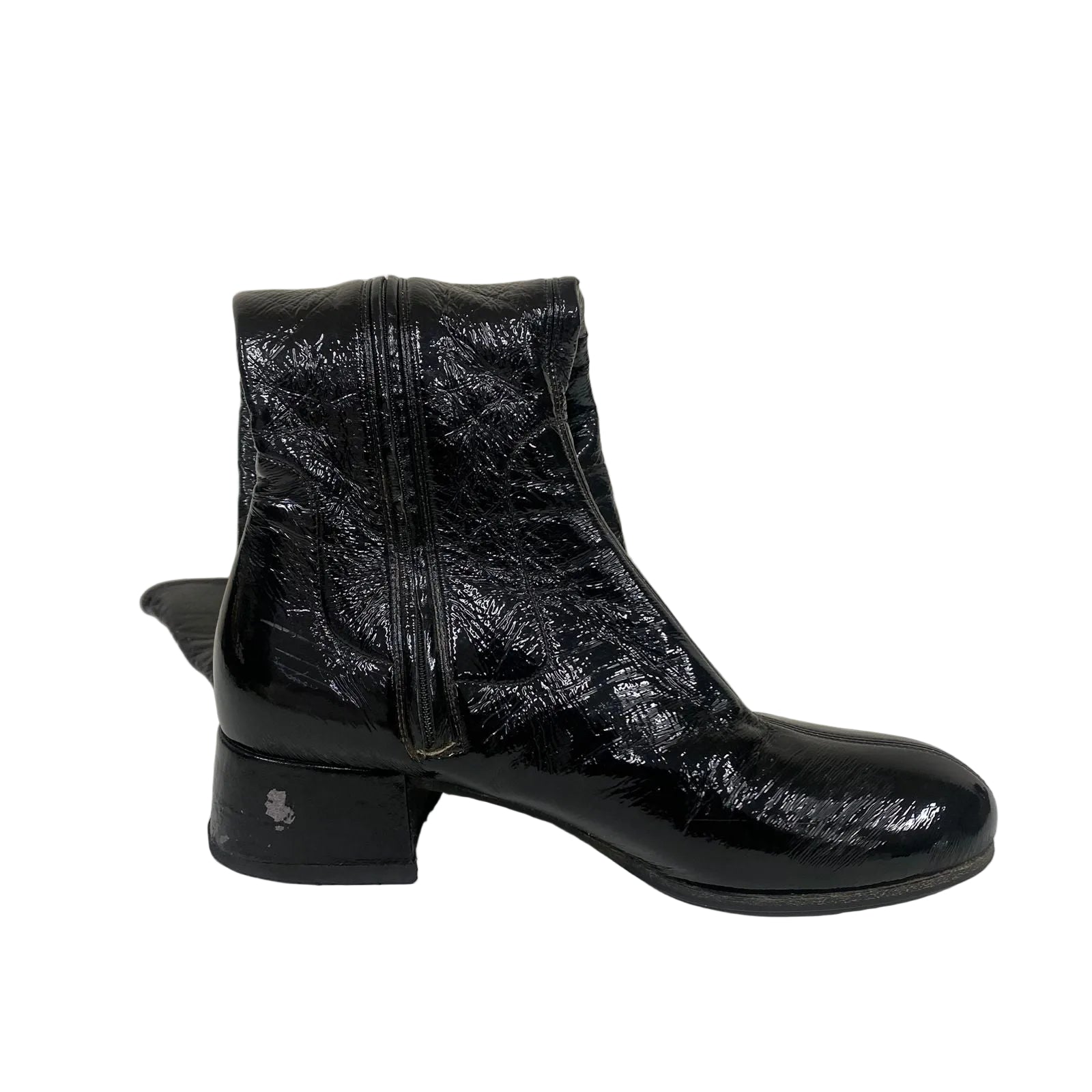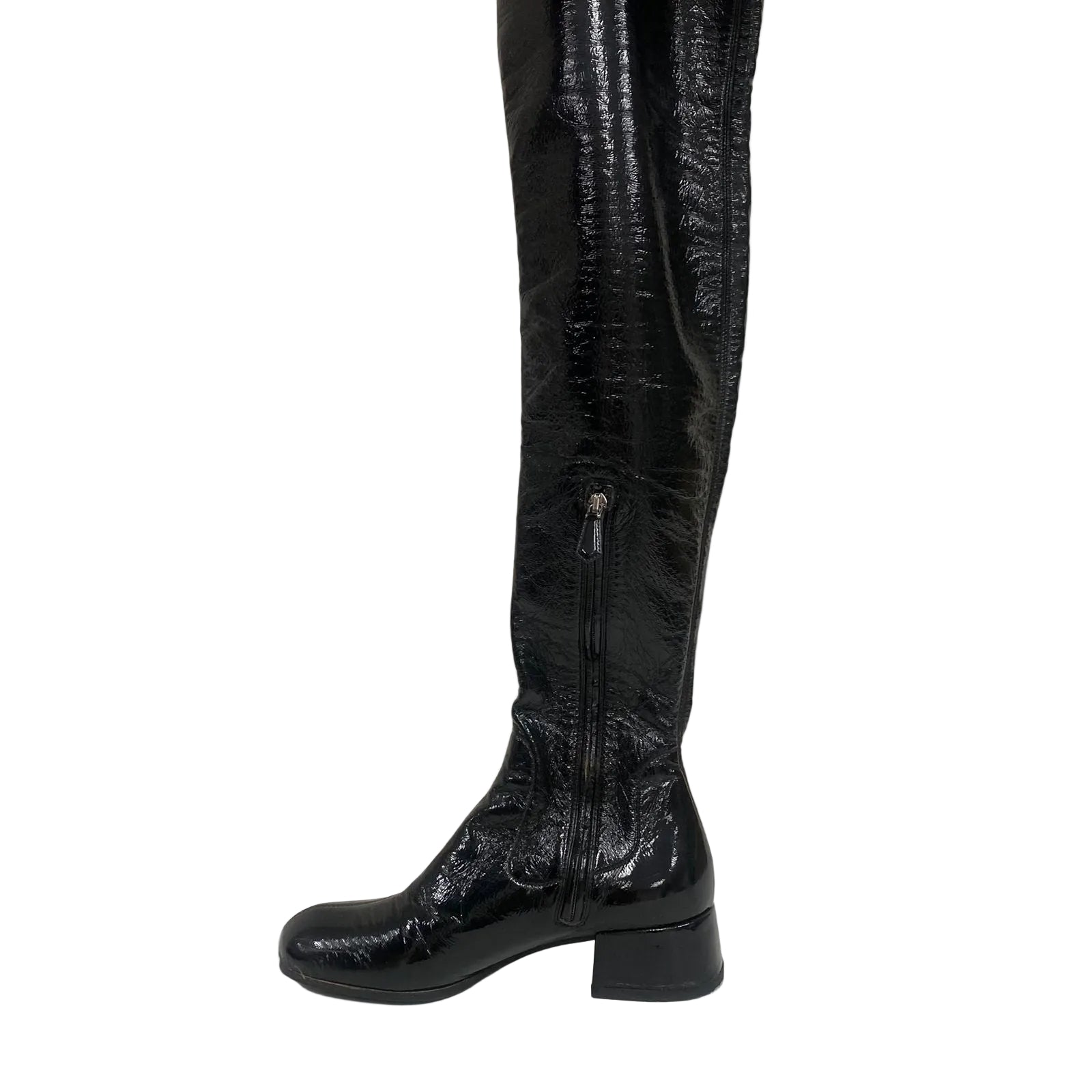 Detalhes: Bota Prada confeccionada em couro envernizado na cor preta. Modelo possui cano longo, bico redondo, logo gravado na sola. Fechamento lateral em zíper.