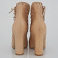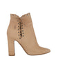 Detalhes: Modelo confeccionado em couro liso na cor bege. Possui cano médio, detalhes de ilhós prateados, bico levemente quadrado e salto médio grosso. Fecho por amarração.