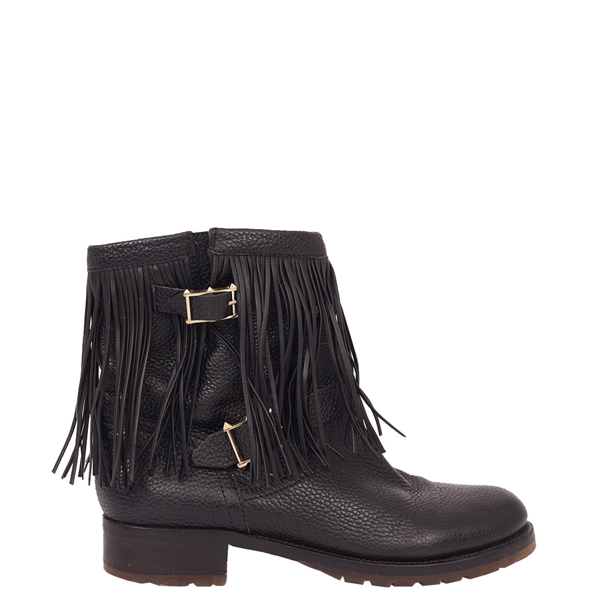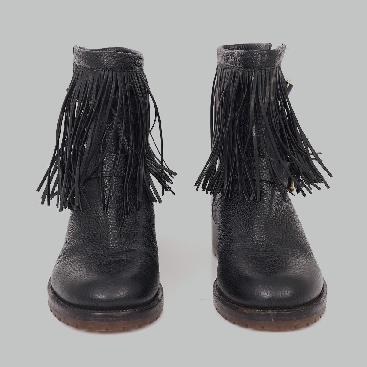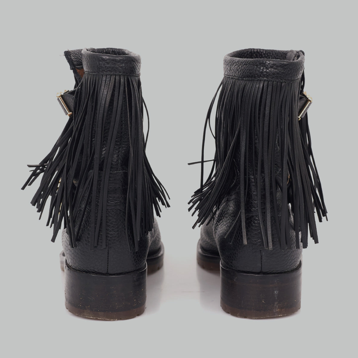 Detalhes: Coturno confeccionado em couro na cor preta. Modelo possui salto baixo grosso, detalhes de franjas em couro e fivelas na lateral. Fechamento por fivela lateral. Ferragens na cor dourada.