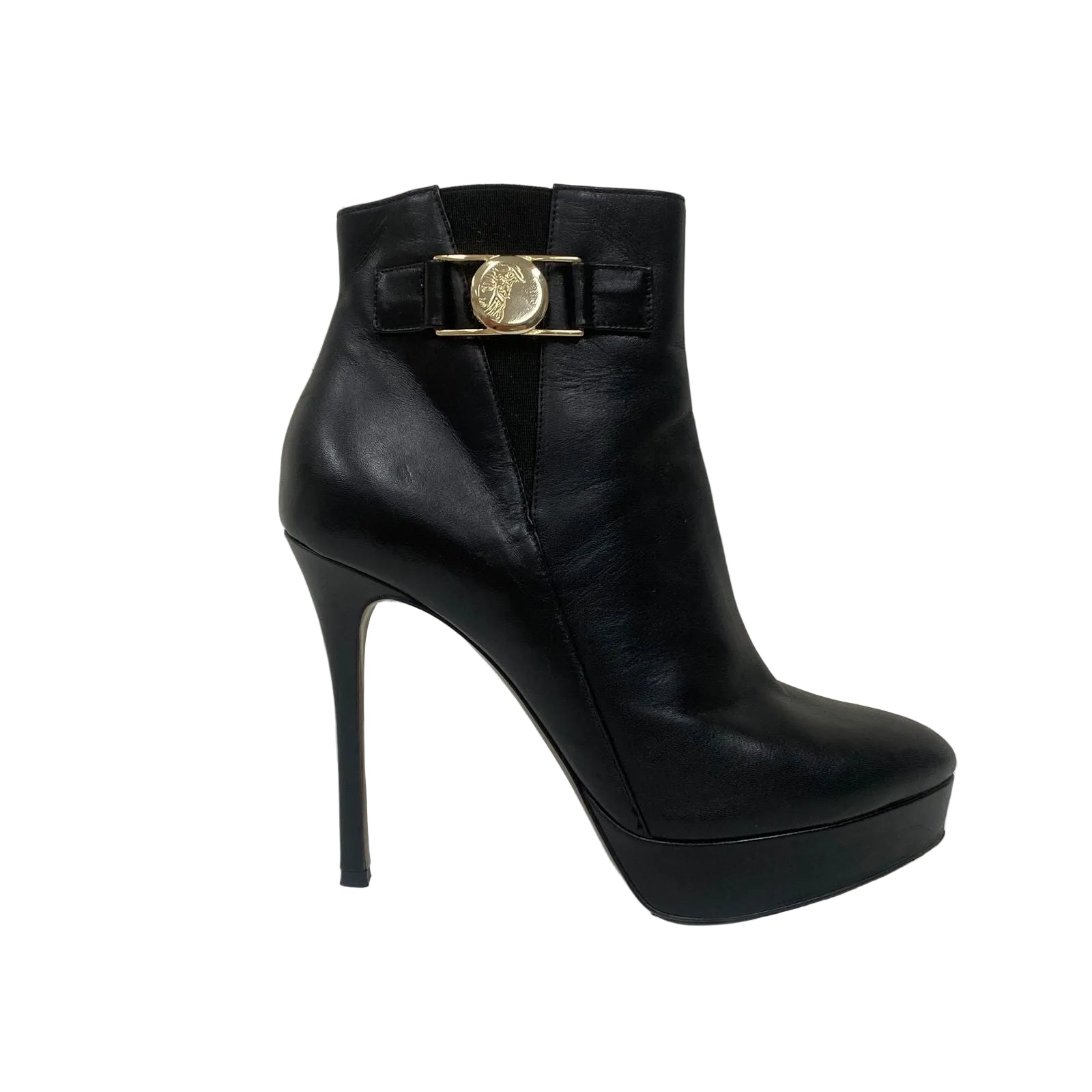 Detalhes: Bota Versace confeccionada em couro na cor Preta com ferragens douradas. Bota com salto fino e bico redondo, com detalhe de elástico no tornozelo.
