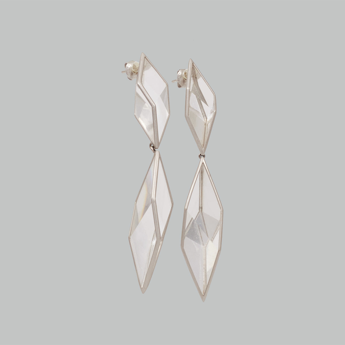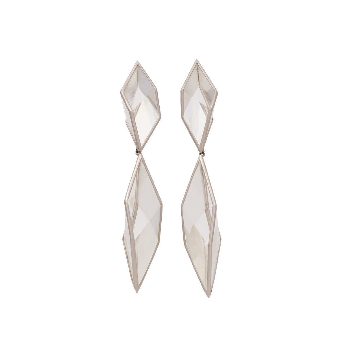 Detalhe: Brinco Antônio Bernardo confeccionado em ouro branco 18k. Modelo possui formato de prisma, 4 quartzos incolores de lapidação losango facetado. Fechamento em tarraxa. *Acompanha estojo.*