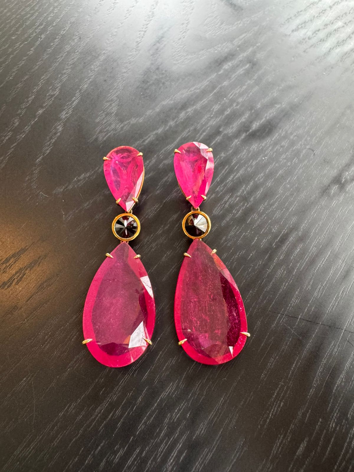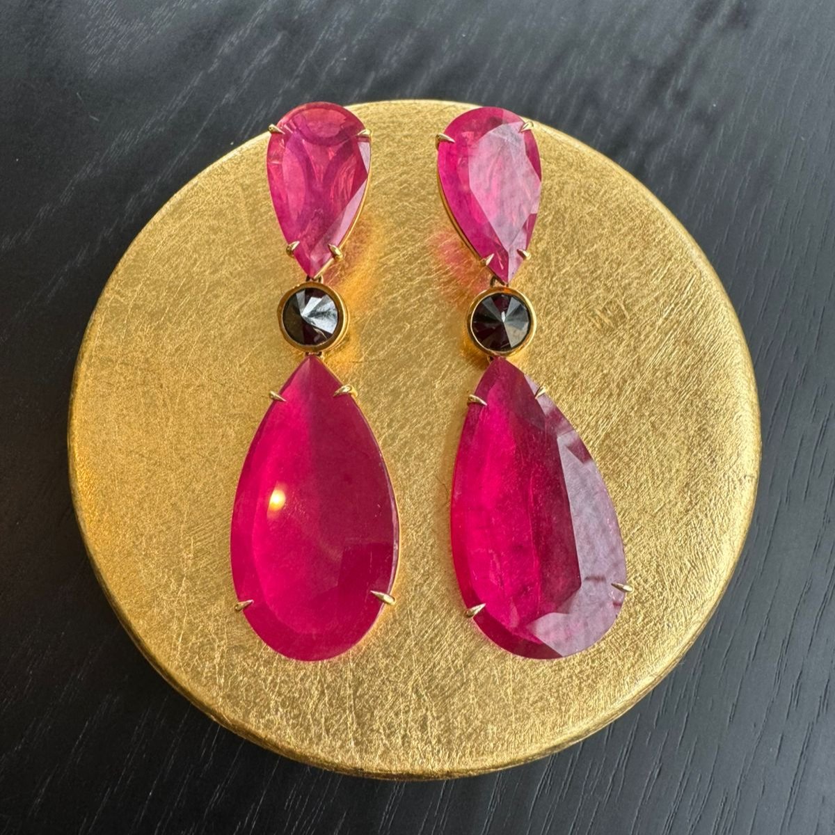 Detalhes: Brinco Ara Vartanian com design em gotas de rubi, com um diamante negro central.