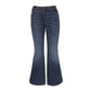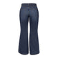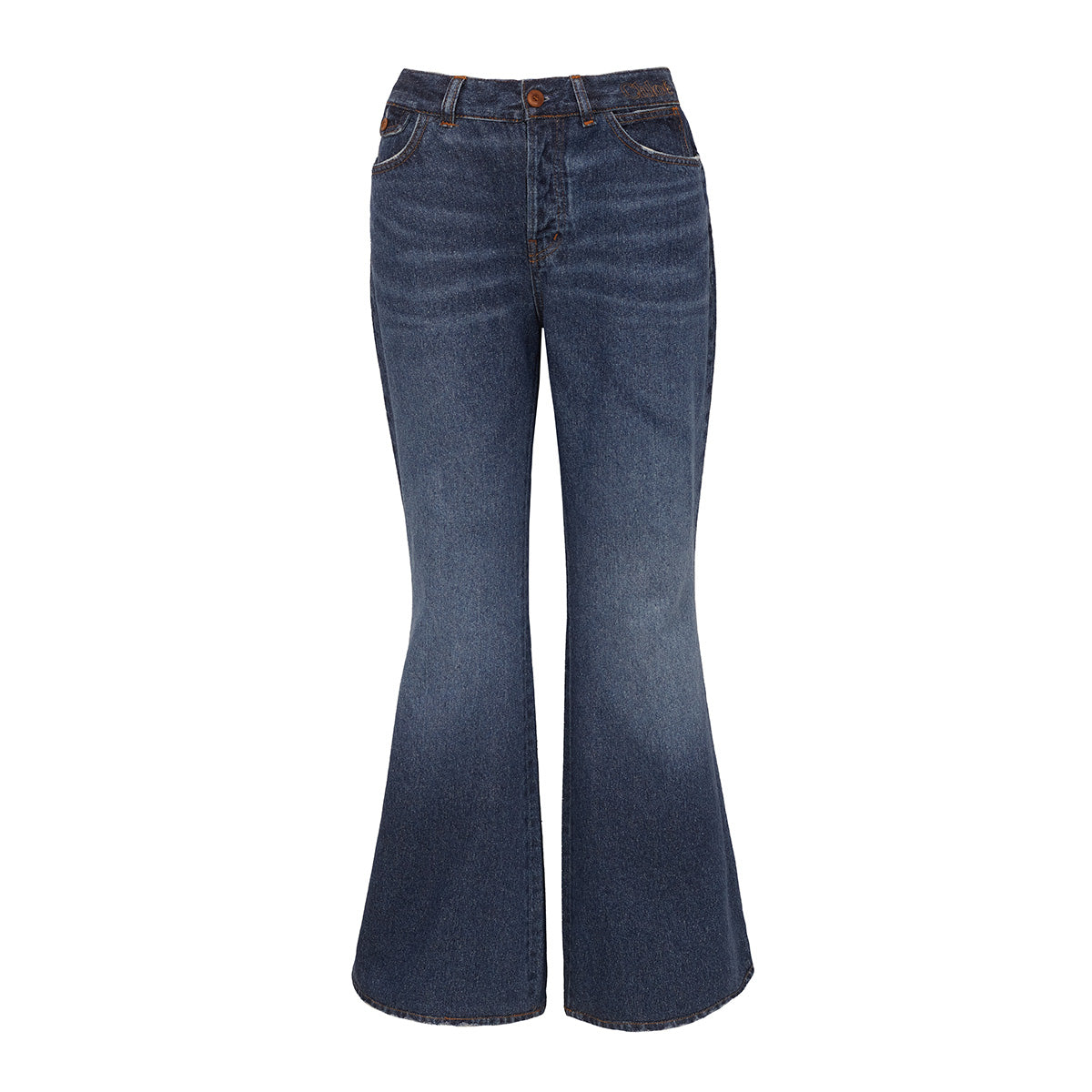 Detalhes: Modelo confeccionado em jeans azul. Possui modelagem flare, cós alto, três bolsos frontais e dois traseiros fecho em botão e zíper, e detalhe do nome da marca costurado na parte frontal.