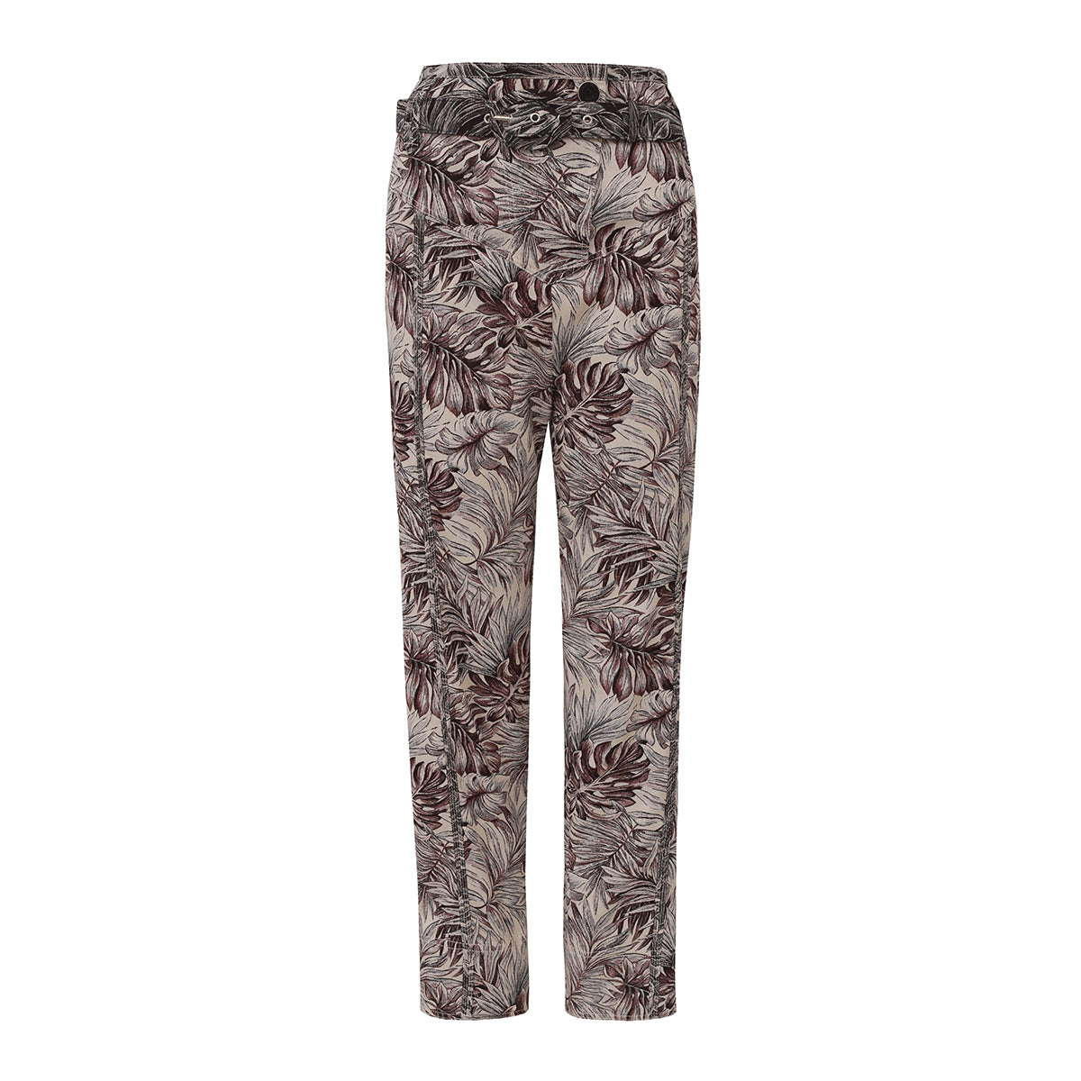 Detalhes: Calça De Goeye confeccionada em tecido estampado com folhagens. Modelagem reta, possui detalhes de costura, cinto na mesma estampa da calça, dois botões na barra para ajuste e forro em linho na parte posterior. Fecho em zíper e botão preto.