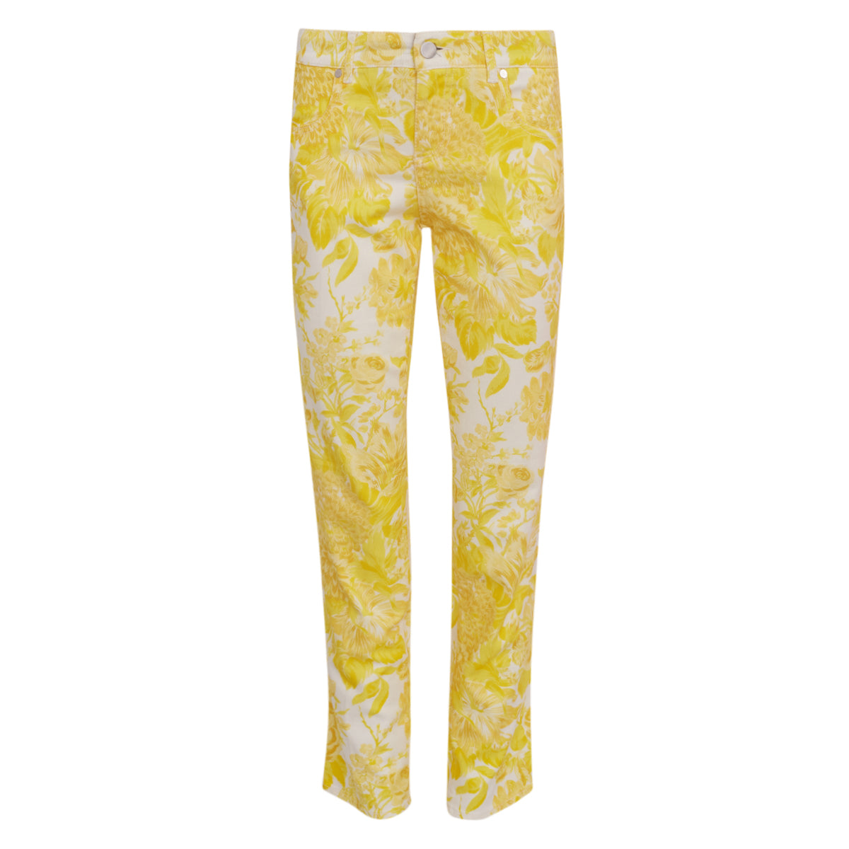 Detalhes: Calça jeans Stella McCartney em base em lavagem branca com estampa florida na cor amarela. Em modelagem reta, cós reto com passantes e cinco bolsos, três frontais e dois traseiros. Pernas em corte reto e regular. Fechamento em ziper e botão.