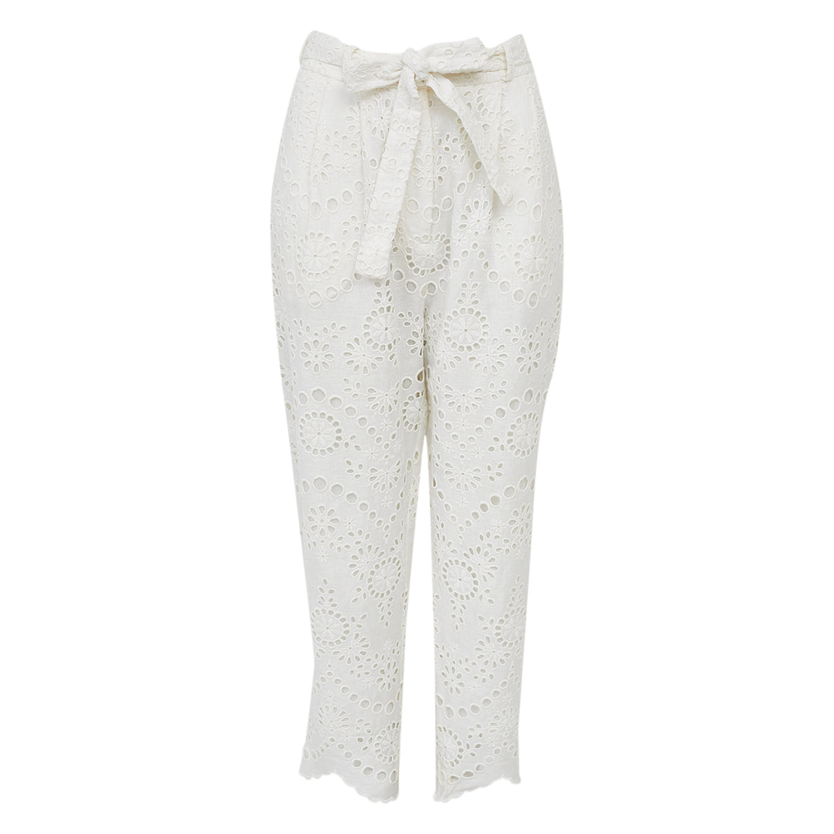 Detalhes: Calça Zimmermann confeccionado em tecido bordado na cor branca. Modelo possui um ziper e um encaixe de fechamento e cordão na cintura.