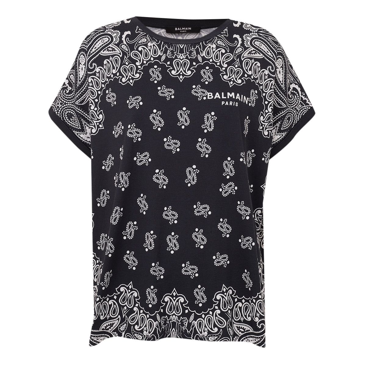 Detalhes: Camisa Balmain feminina confeccionada em tecido preto com estampa estilo bandana em branco por toda a peça. Modelo de gola careca, com logo ´´BALMAIN PARIS´´ eplicado na parte frontal.