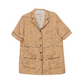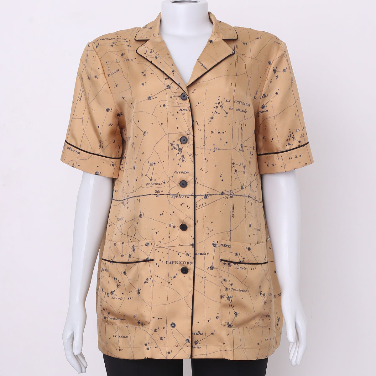 Detalhes: Camisa Christian Dior confeccionada em seda na cor bege com estampa escrita e pontilhada na cor azul marinho e estampa localizada nas costas em animais em tons de verde,azul,amarelo e branco. Possui mangas curtas com punho em viés,gola pólo dobrável, dois bolsos frontais aplicados a parte inferior e fechamento em botões redondos azul marinho.