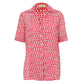 Detalhes: camisa De Goye, possui mangas curtas, poá rosa e fecho por abotoamento.