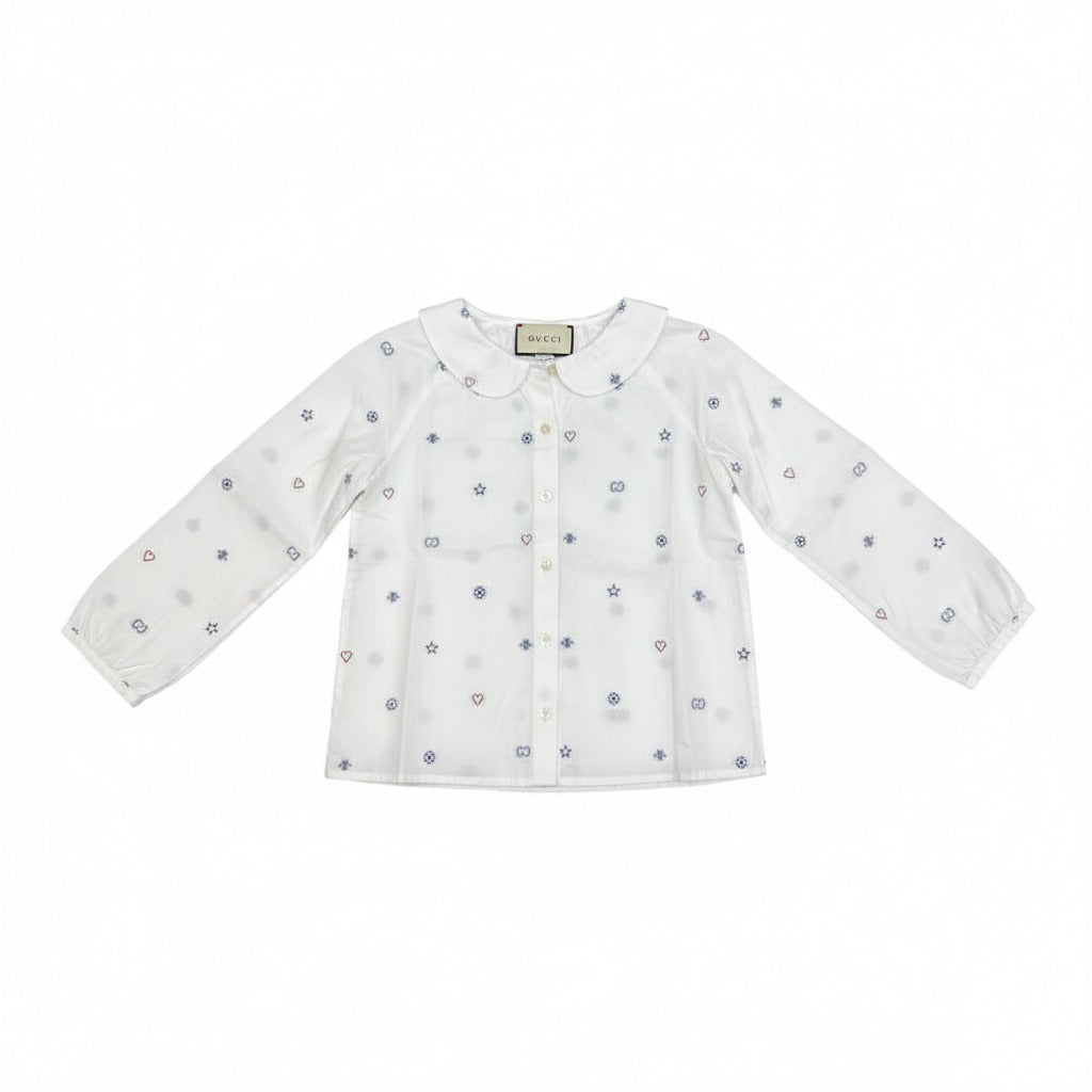 Detalhes: A camisa é adornada com pequenos bordados em azul claro, incluindo estrelas, corações e o logotipo "G" da marca.Possui gola Peter Pan e mangas compridas com punhos.