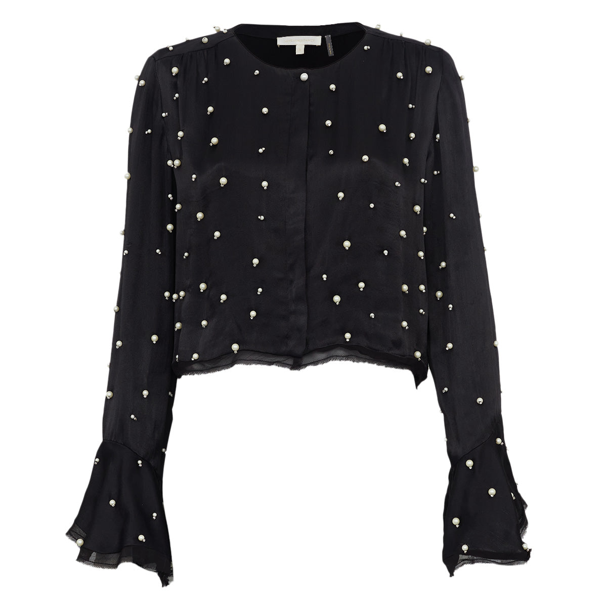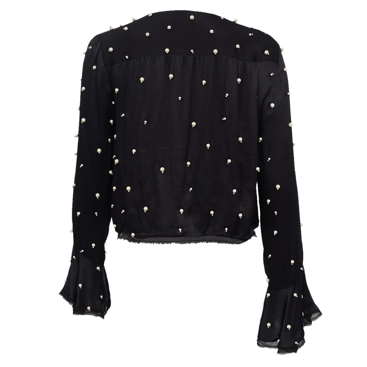 Detalhes: Camisa Love Shack Fancy preta acetinada, modelo possui mangas longas com detalhe flare no punho, pérolas bordadas com pedrinha brilhante e botões frontais escondidos.
