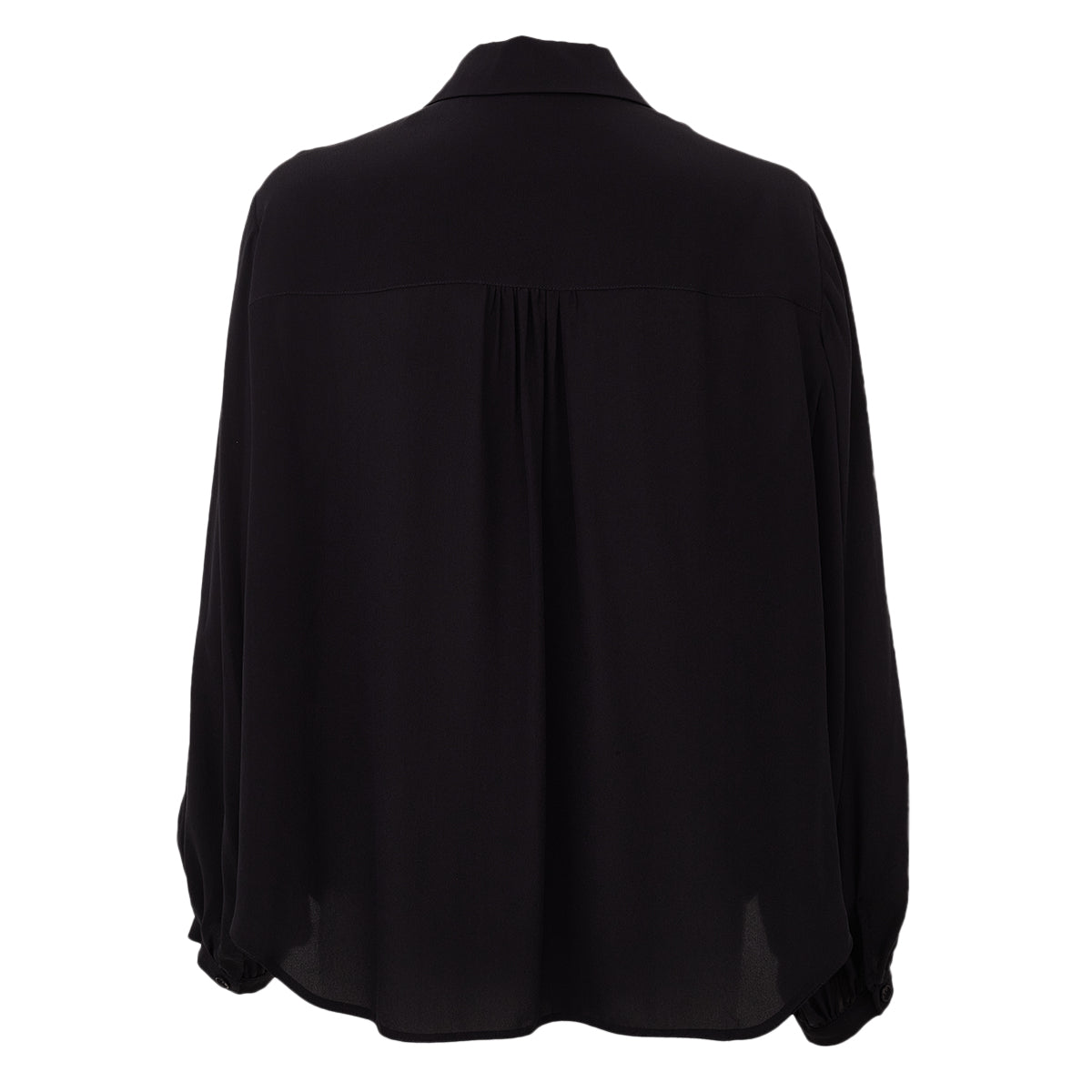 Detalhes: Camisa NK confeccionada em seda na cor preta. Camisa de manga comprida com gola colarinho com fechamento por cordão e fechamento frontal por botões. As mangas são bufantes e franzidas nos punhos com um botão.