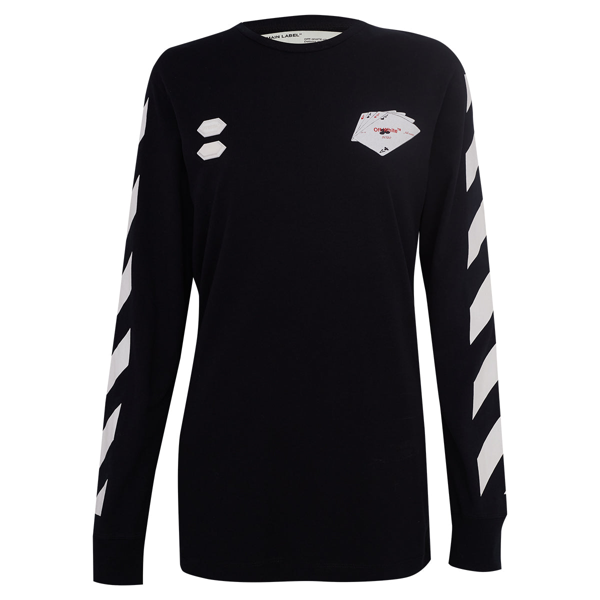 Detalhes: Camiseta Off White confeccionada em algodão na cor preta. Modelo possui gola redonda, mangas longas, logo em relevo do lado esquerdo, estampas nas mangas e costas, barra reta.