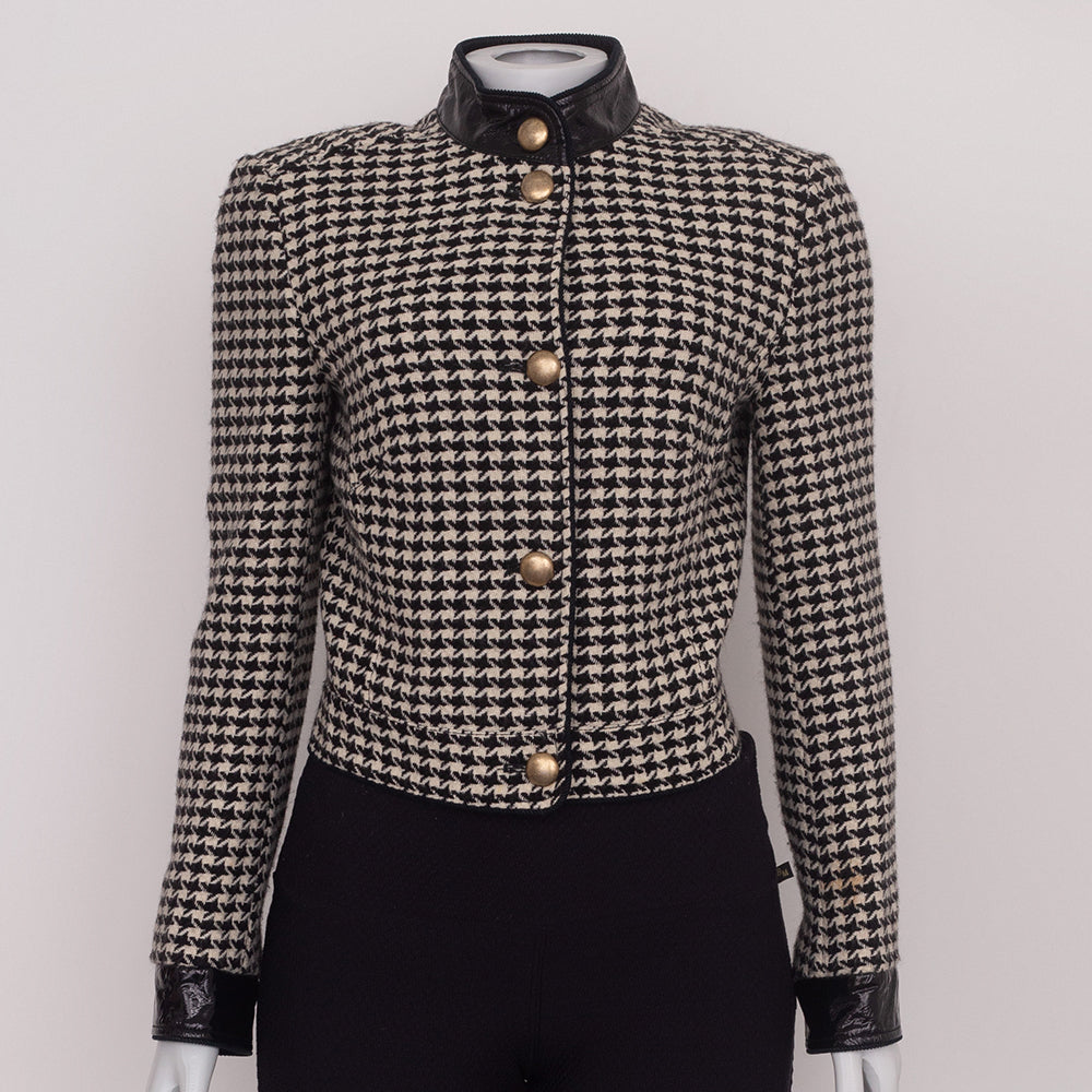 Forro: 73% Viscose 27%Cotton Detalhes: Casaco Dolce & Gabbana em estampa Pied Poule nas cores branco e preto e botões redondos dourados. Em modelagem casaqueto, gola padre com aplicação de couro vinil na cor preta. Mangas longas com punho também em couro vinil. Fechamento em botões.