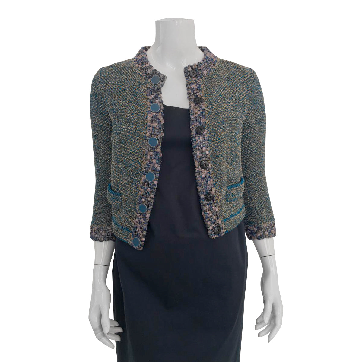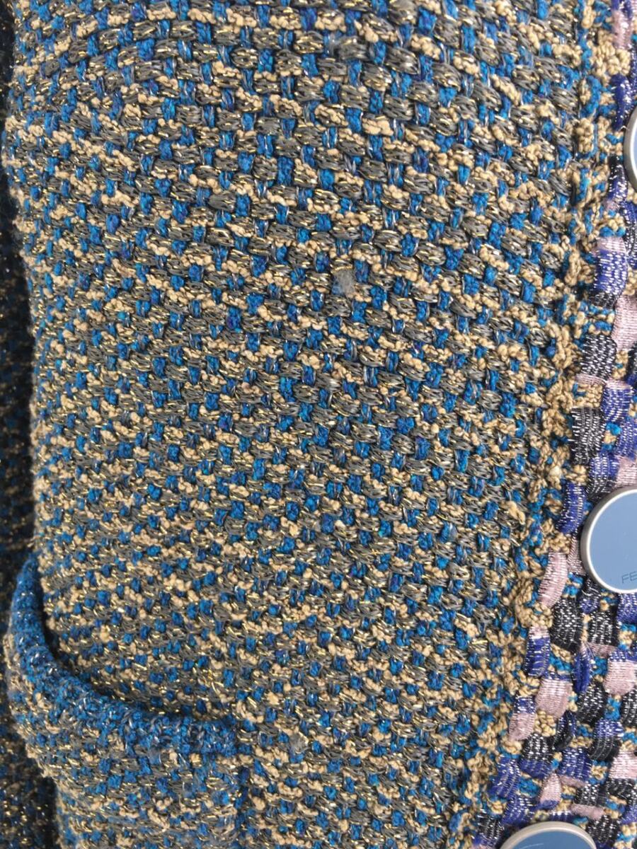Detalhes: Casaco Fendi Azul Metalizado Tweed tam. 38. Modelo com botões azuis, bordados nos cantos.