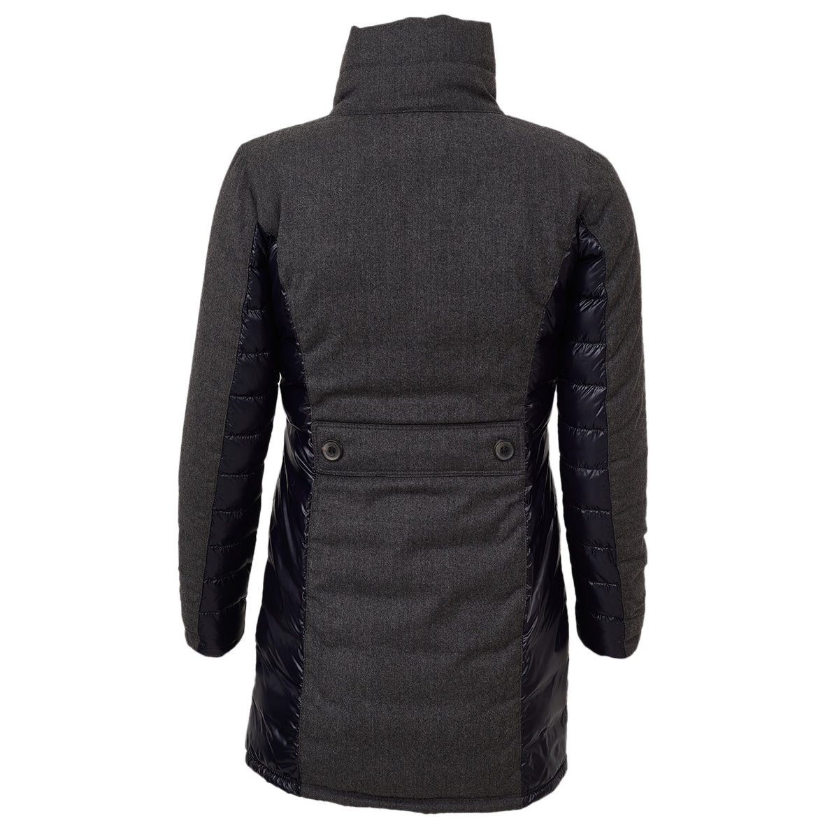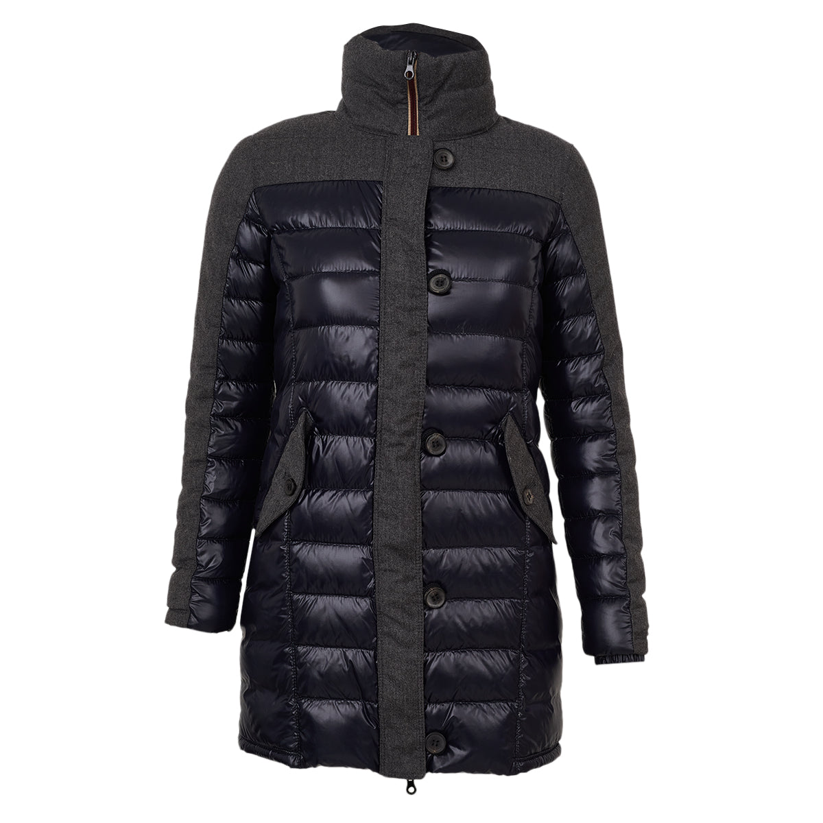 Detalhes: Casaco Puffer Duveti confeccionado em tecido na cor azul com detalhe cinza. Modelo longo, mangas compridas e gola em tecido.