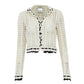 Detalhes: Casaquinho Chanel em crochet na cor branco com acabamentos em tecido preto. Possui comprimento curto, mangas longas e fechamento em botões na parte frontal.