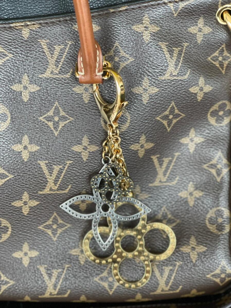Detalhes: O modelo possui modelo possui mosquetão, pingentes com monogramas da marca em dourado, prata e chumbo.