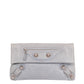 Detalhes: Clutch Balenciaga confeccionada em couro na cor azul bebê. Modelo possui formato retangular, bolso frontal com zíper e aba flap. Parte interna em tecido preto, conta com dois compartimentos. Ferragem prateadas. Fechamento em botão magnético. Acompanha espelho.
