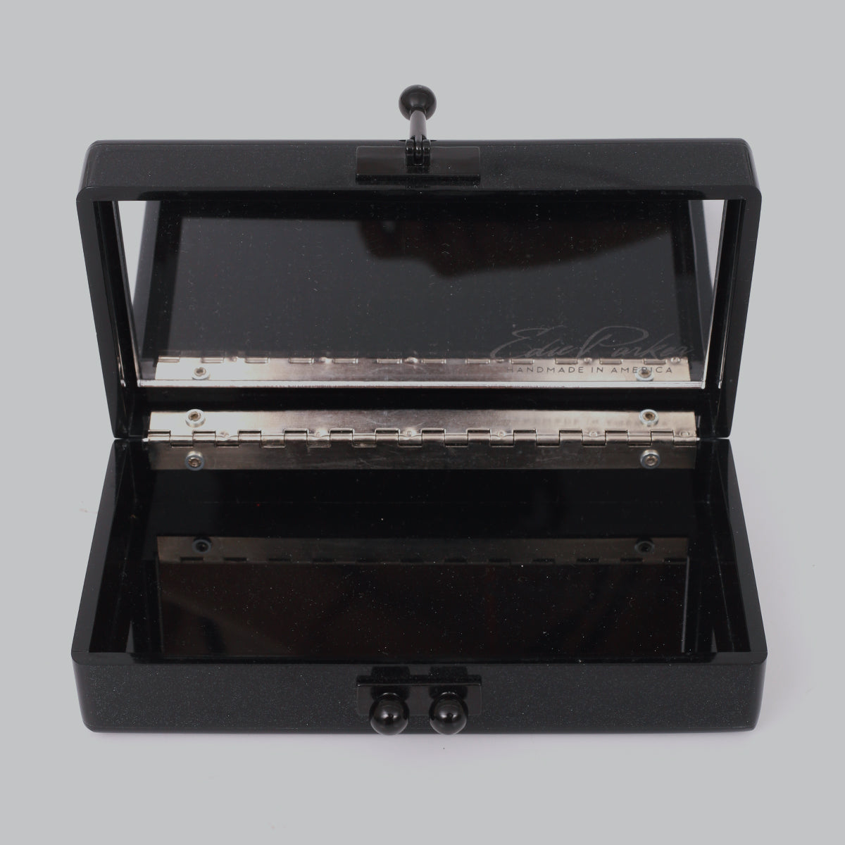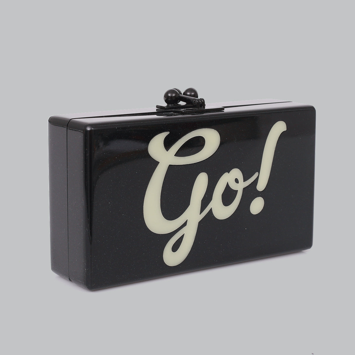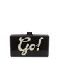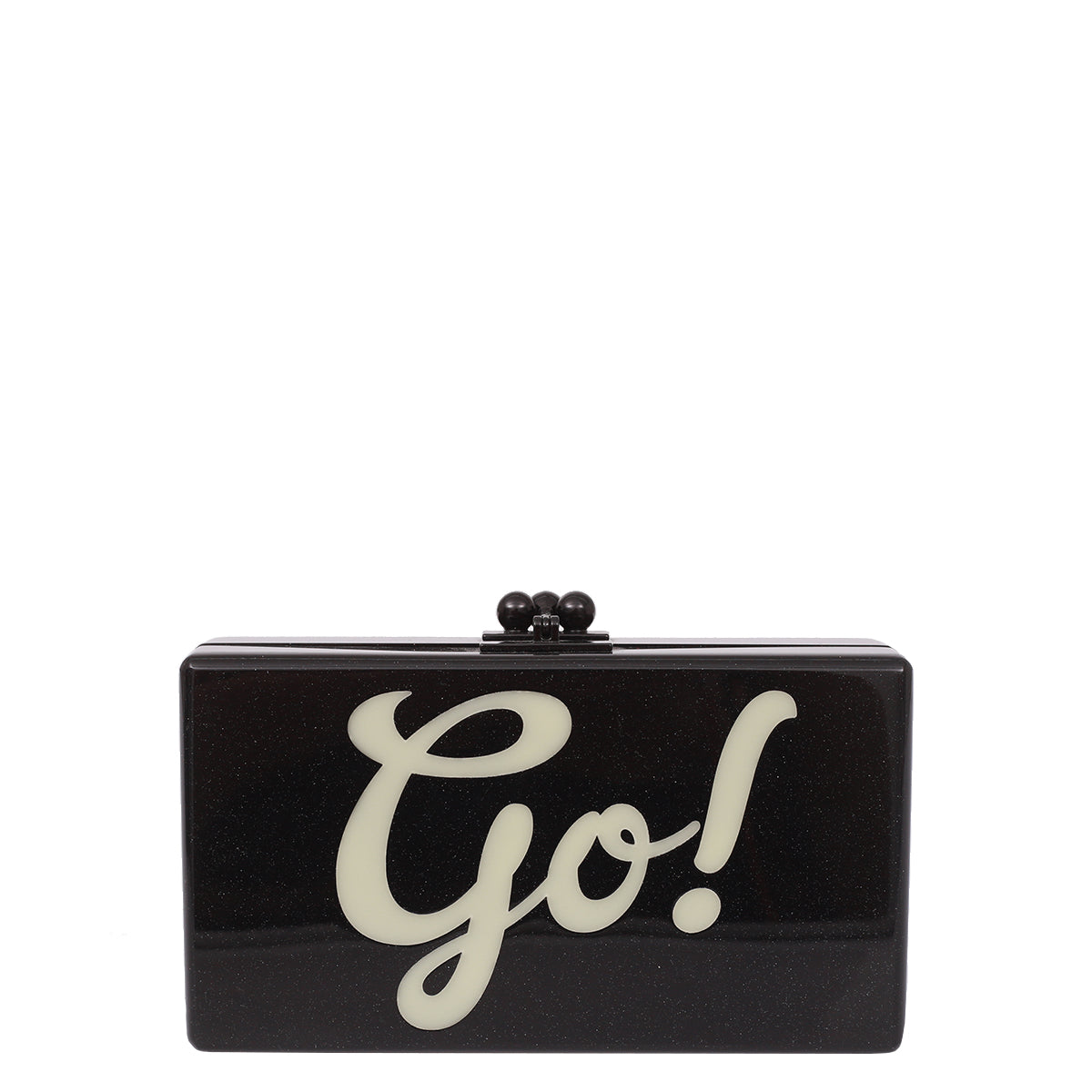 Descrição: Clutch Edie Parker modelo retangular confeccionado em acrílico preto brilhoso com o escrito 'Go!' na cor off white na parte da frente. Fecho de encaixe. Compartimento único, com espelho interno.