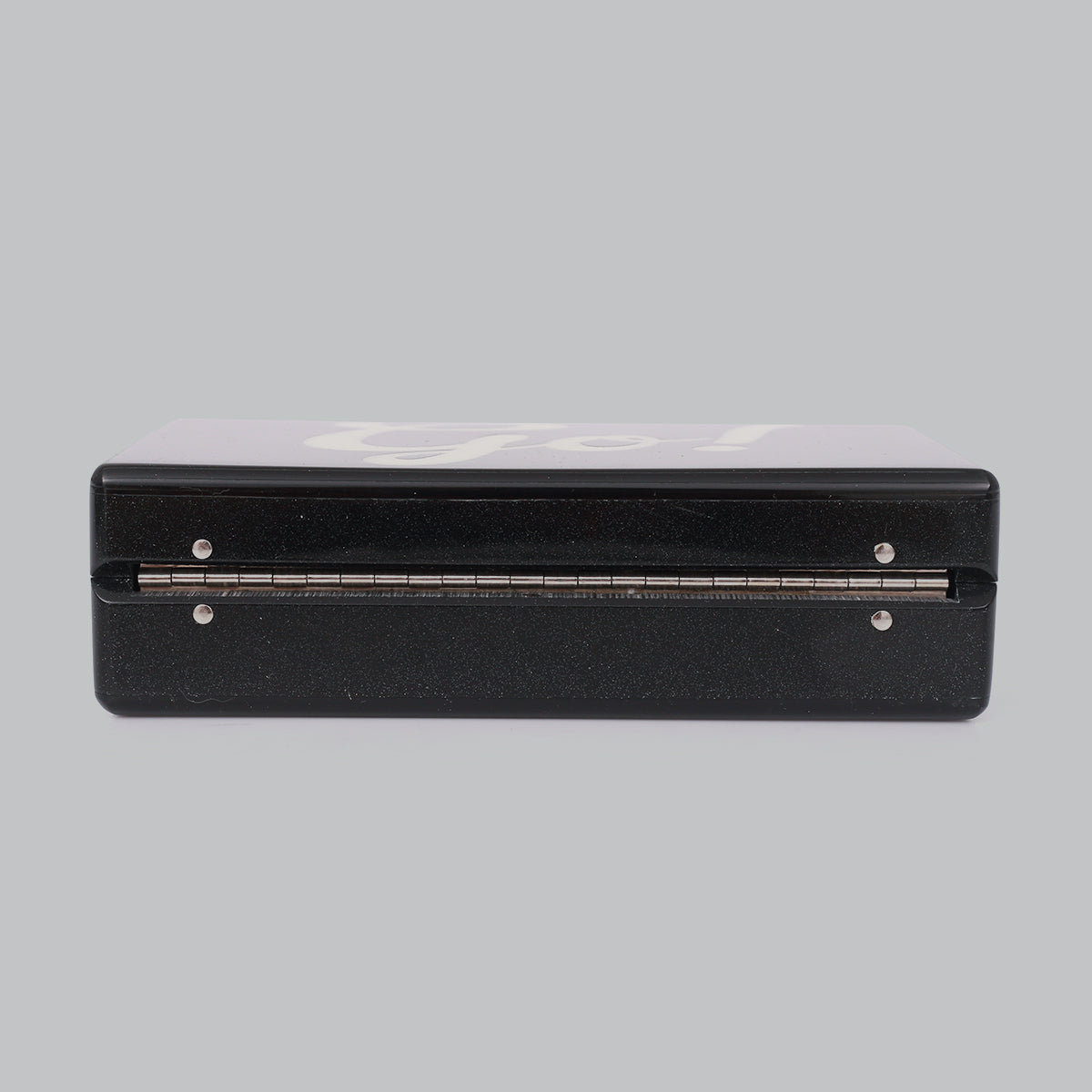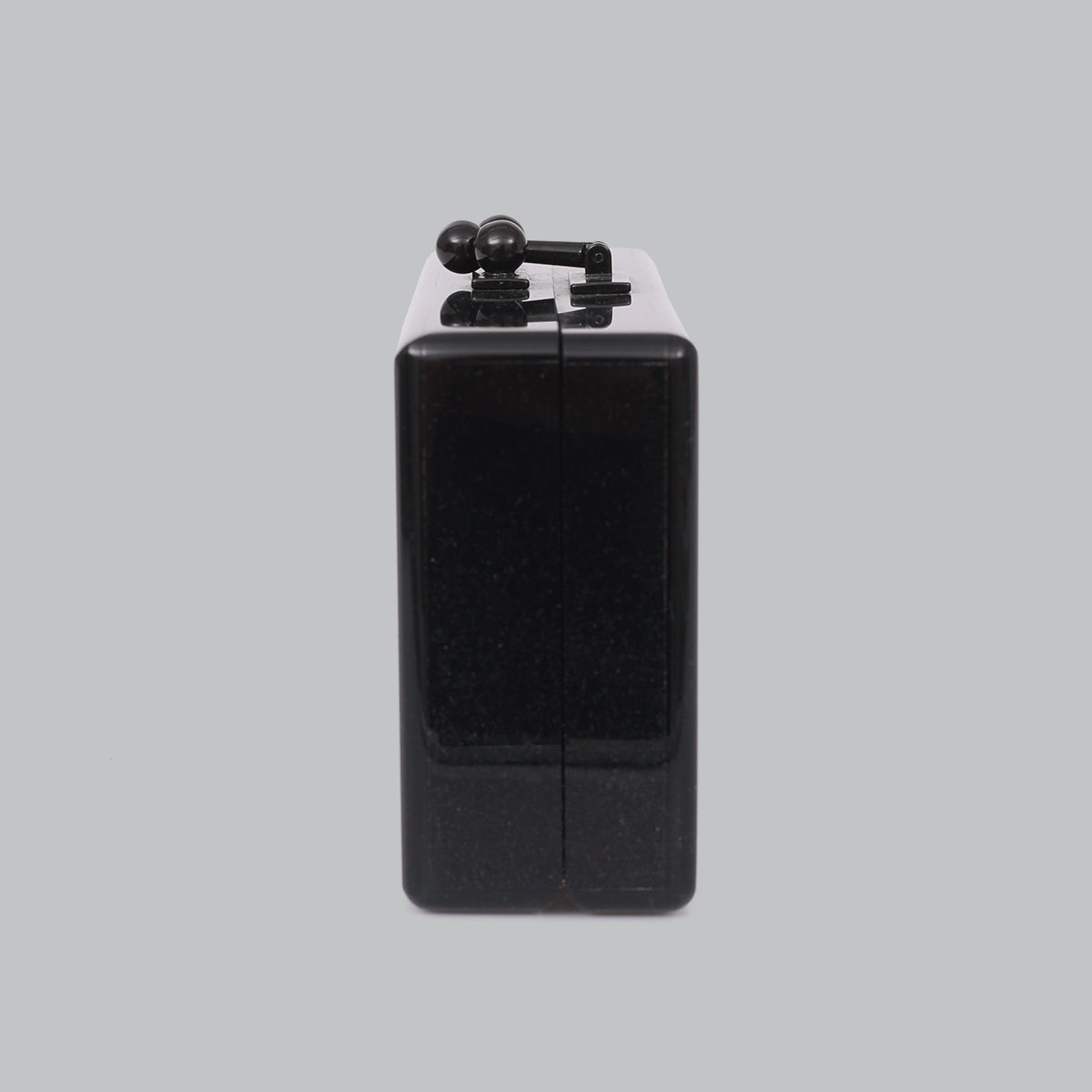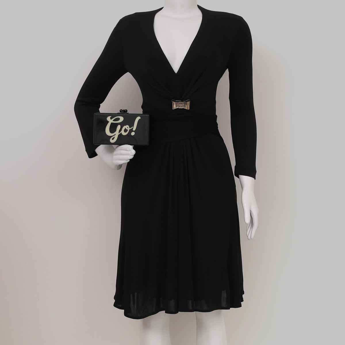 Descrição: Clutch Edie Parker modelo retangular confeccionado em acrílico preto brilhoso com o escrito 'Go!' na cor off white na parte da frente. Fecho de encaixe. Compartimento único, com espelho interno.