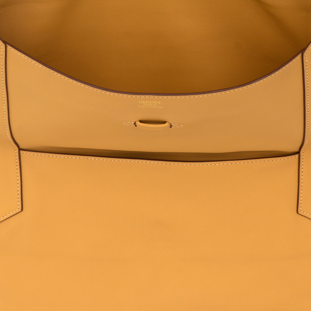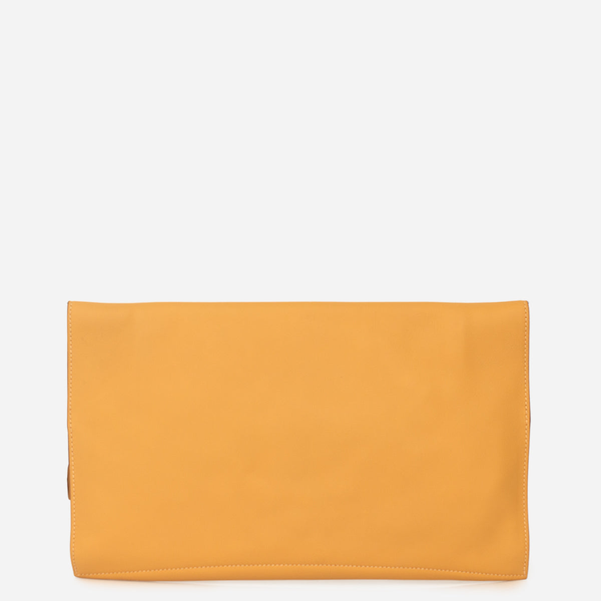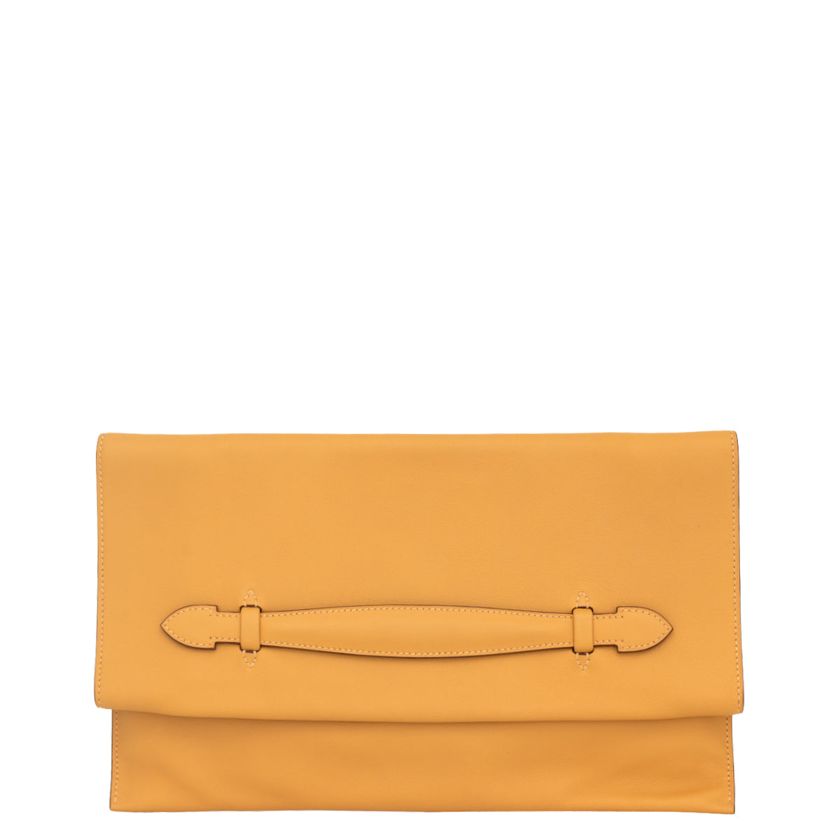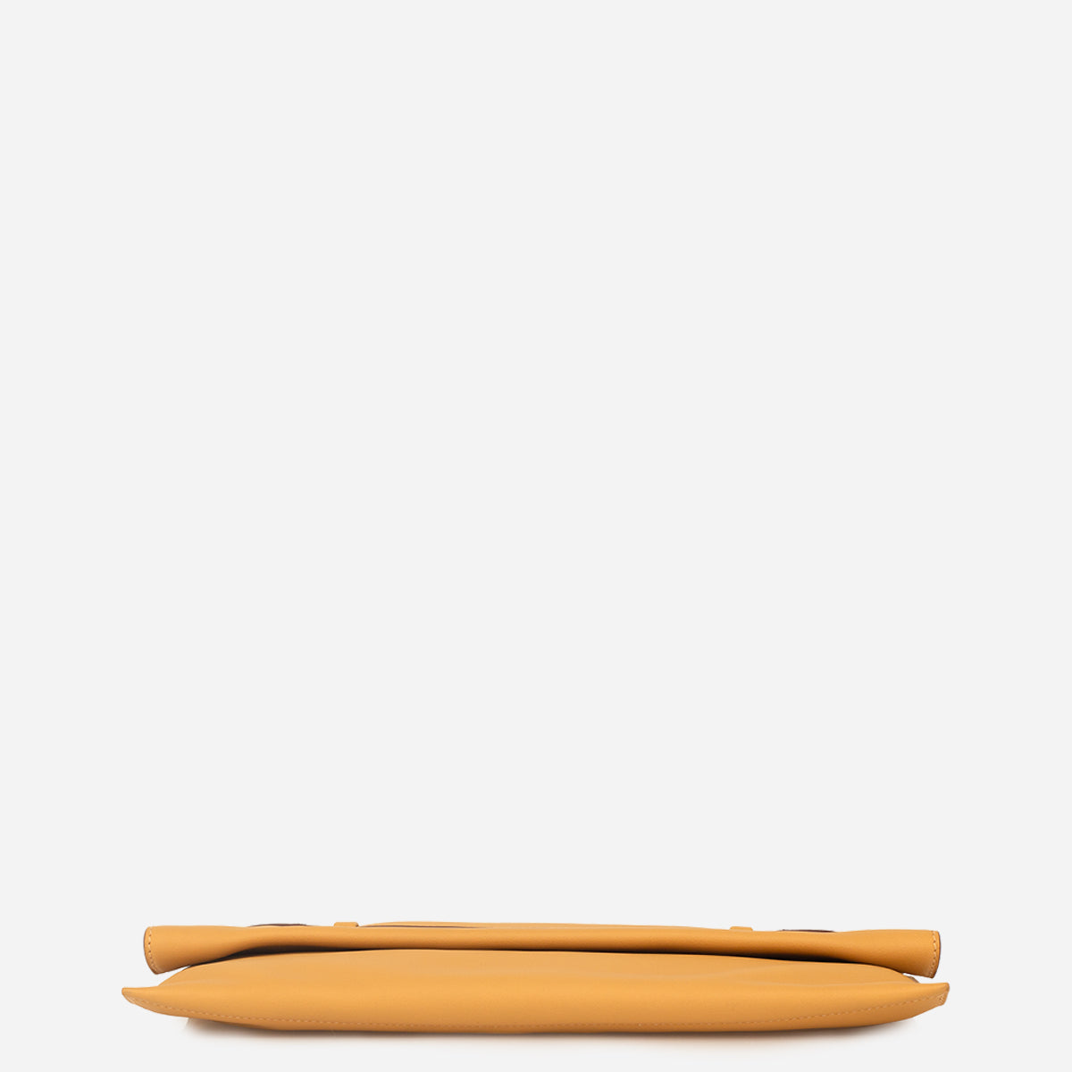 Detalhes: Clutch Hermes Amarelo Mostarda Grande. Envelope modelo com apoio de mãos e dois bolsos internos, sendo um grande e outro médio