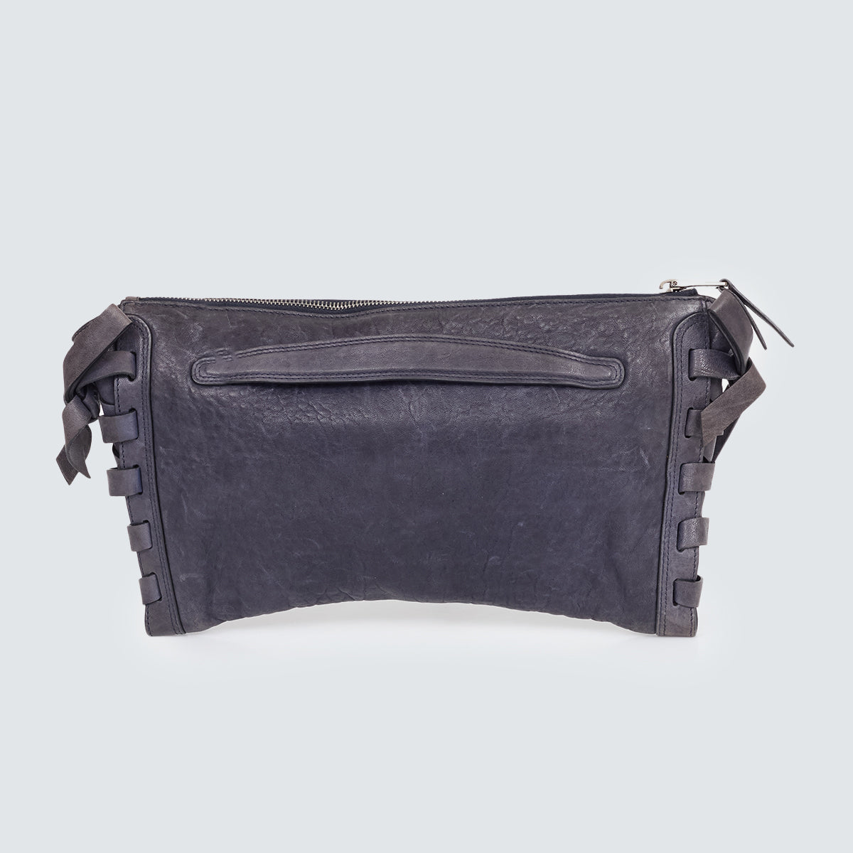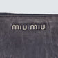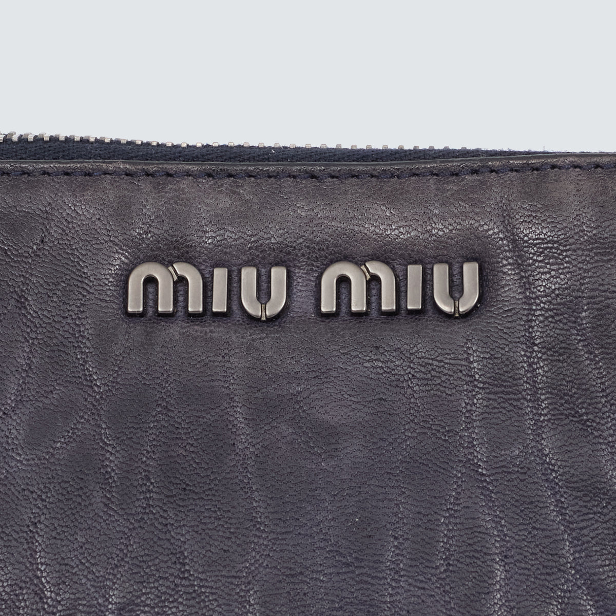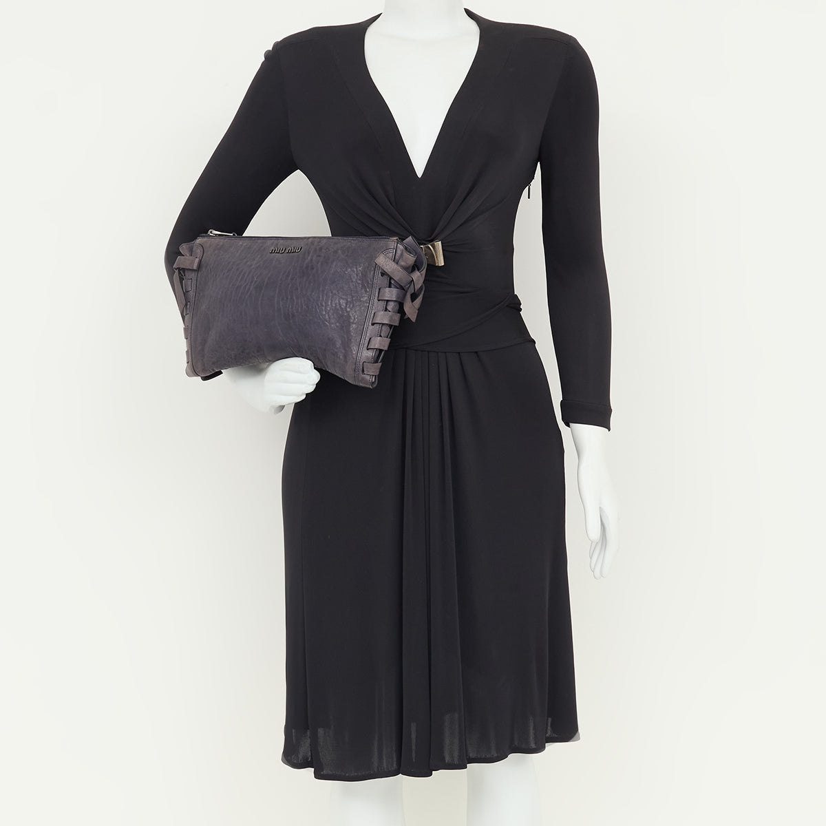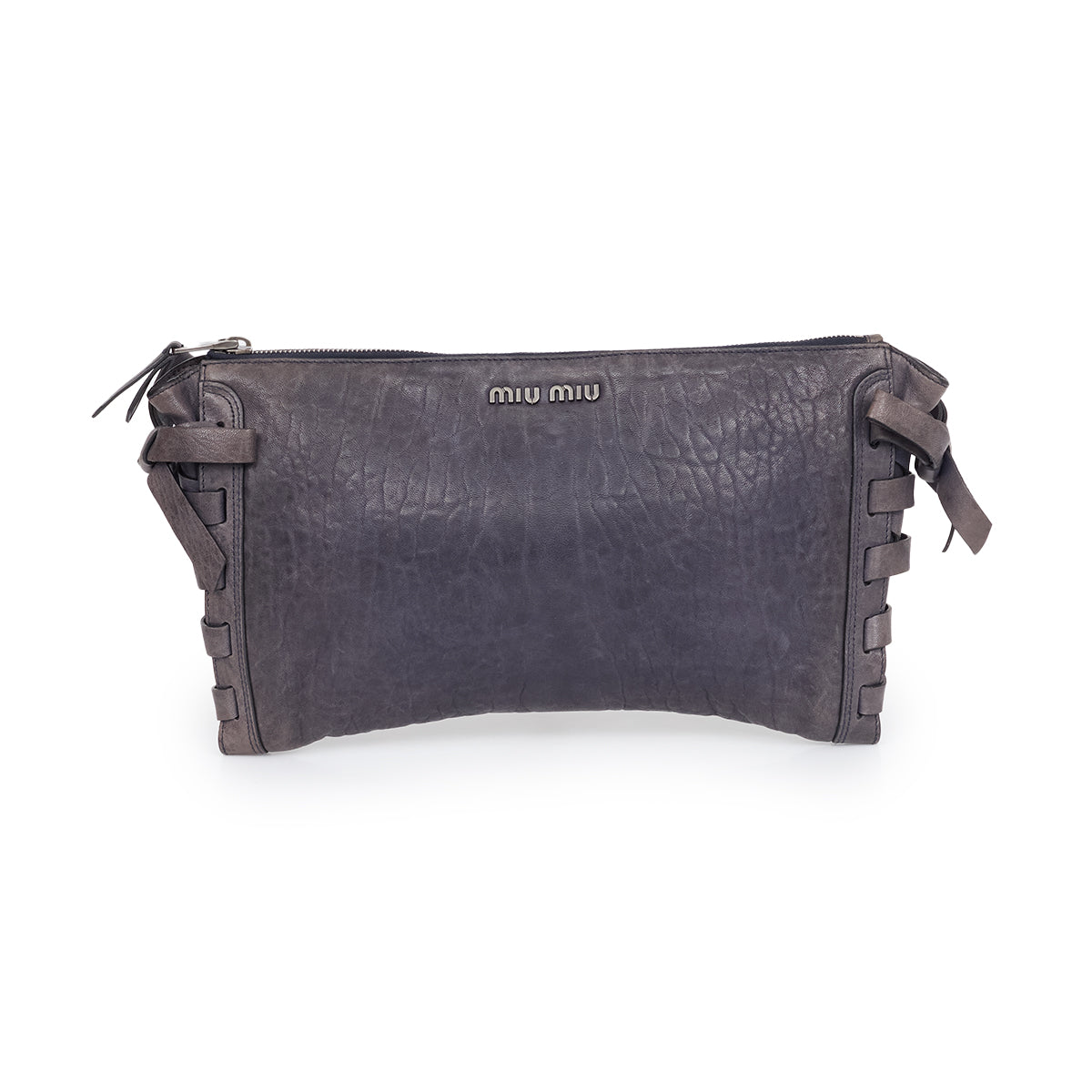 Detalhes: Clutch Miu Miu confeccionada em couro na cor cinza. O modelo possui formato retangular com detalhe da marca coloca a mão. Possui detalhes de amarração na lateral, bolso interno e fechamento em zíper.