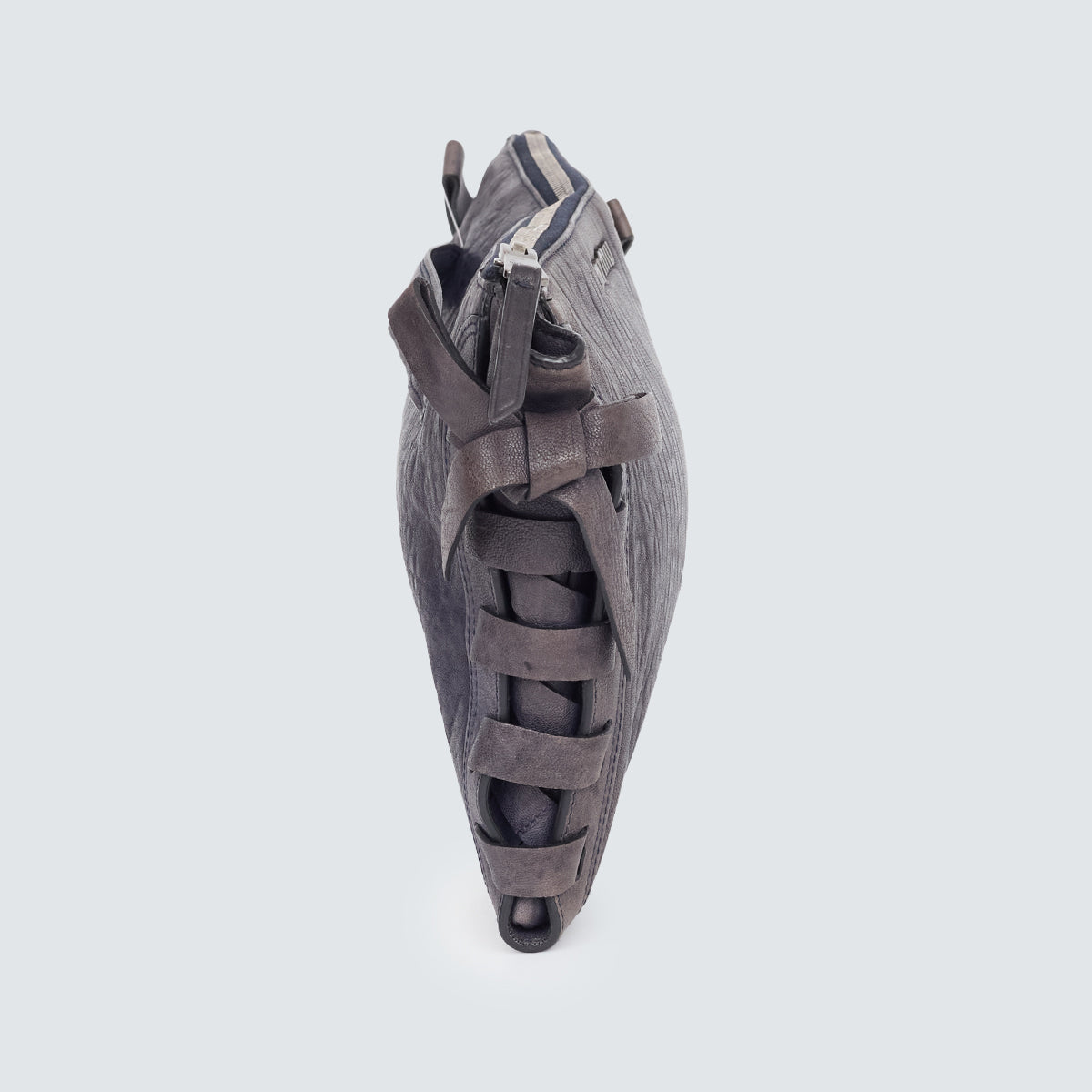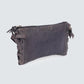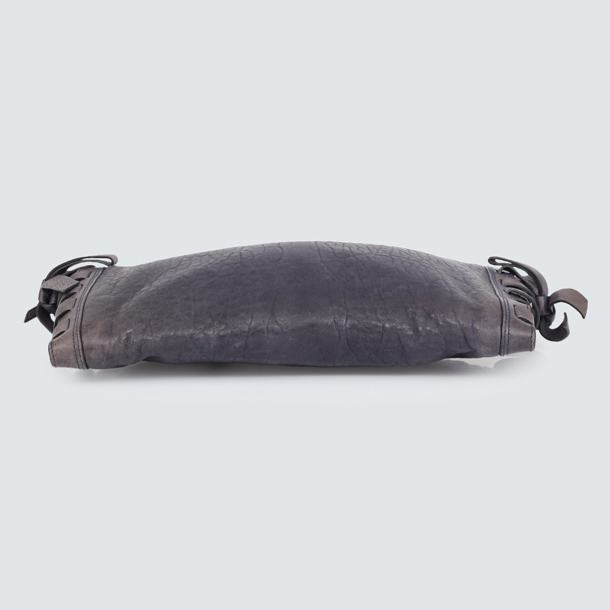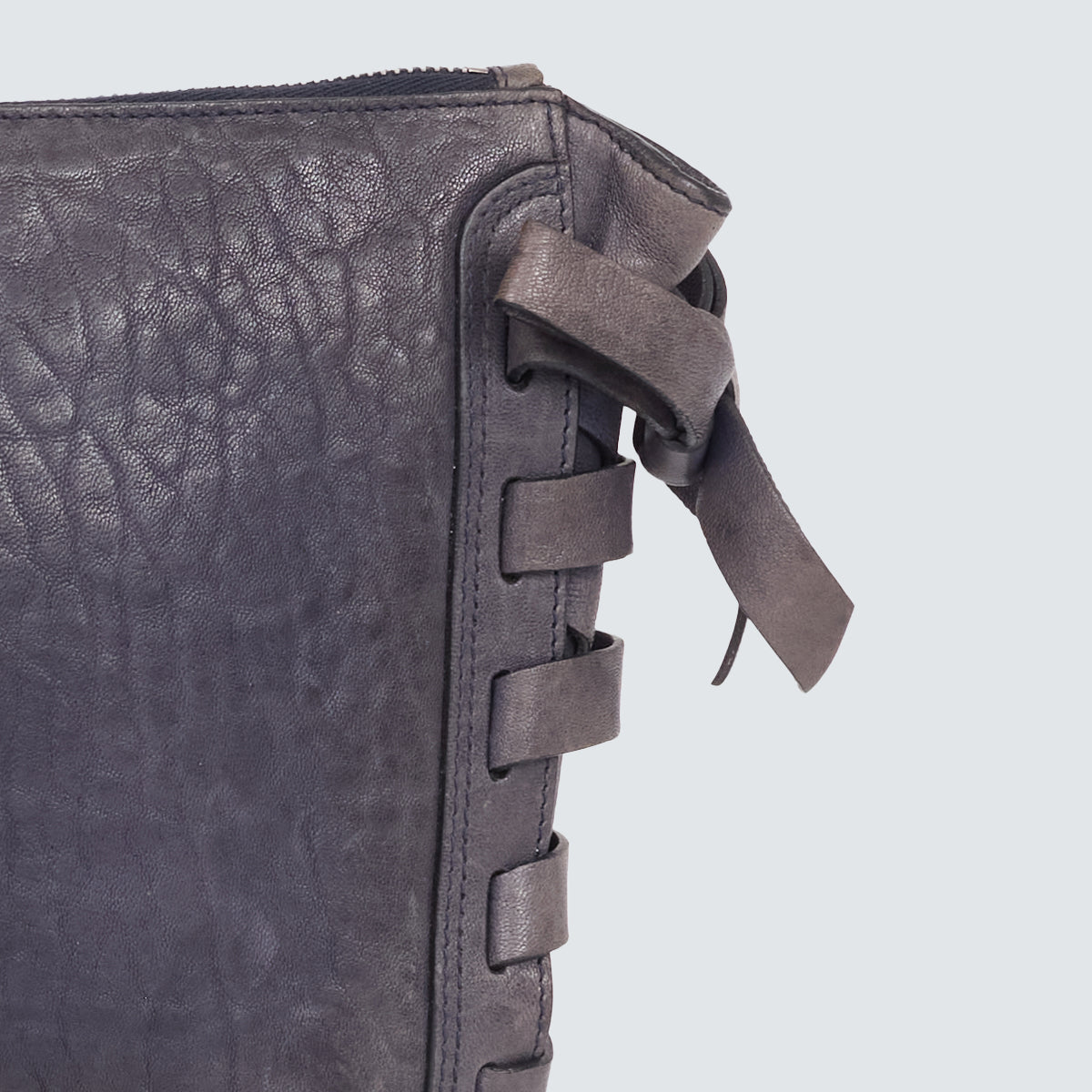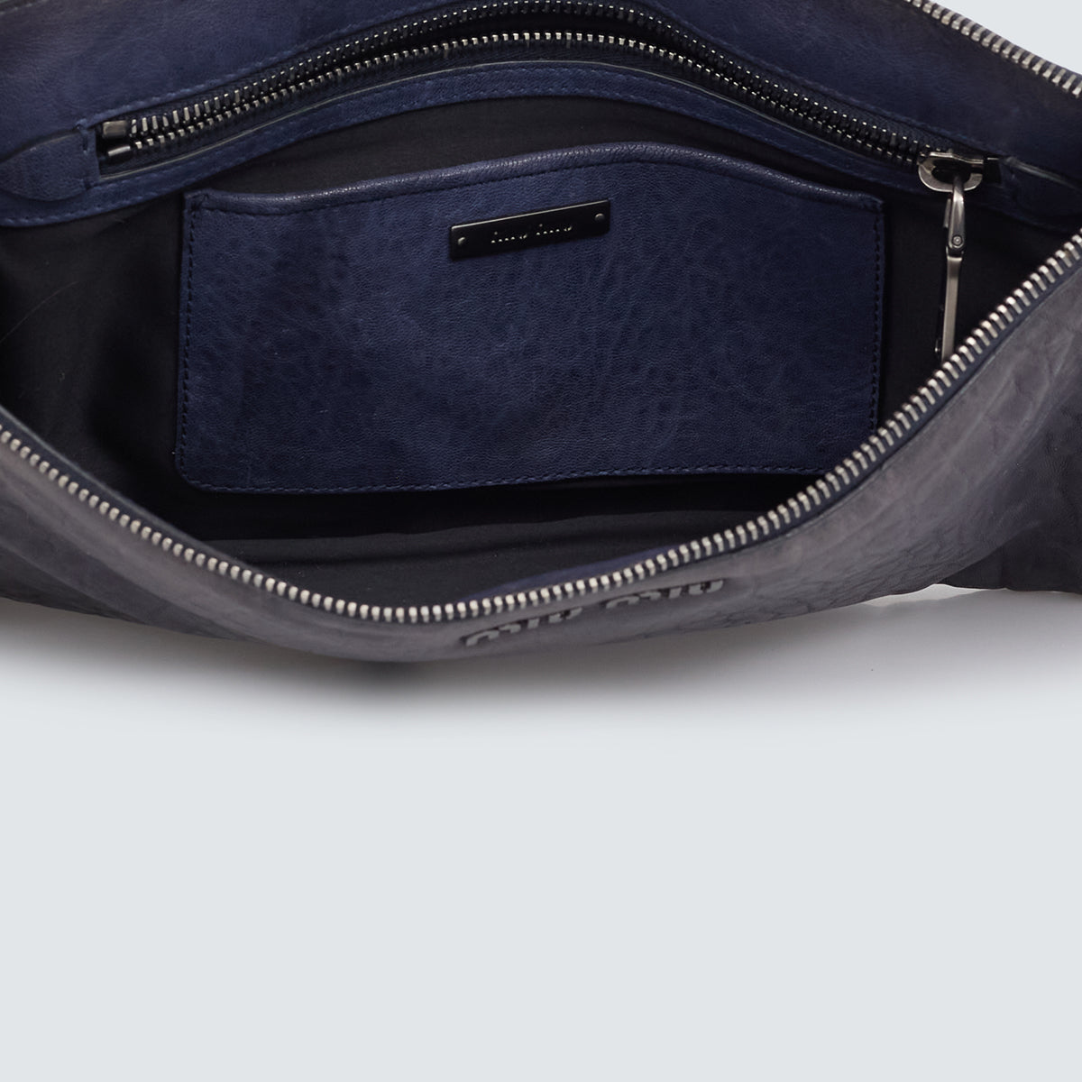 Detalhes: Clutch Miu Miu confeccionada em couro na cor cinza. O modelo possui formato retangular com detalhe da marca coloca a mão. Possui detalhes de amarração na lateral, bolso interno e fechamento em zíper.