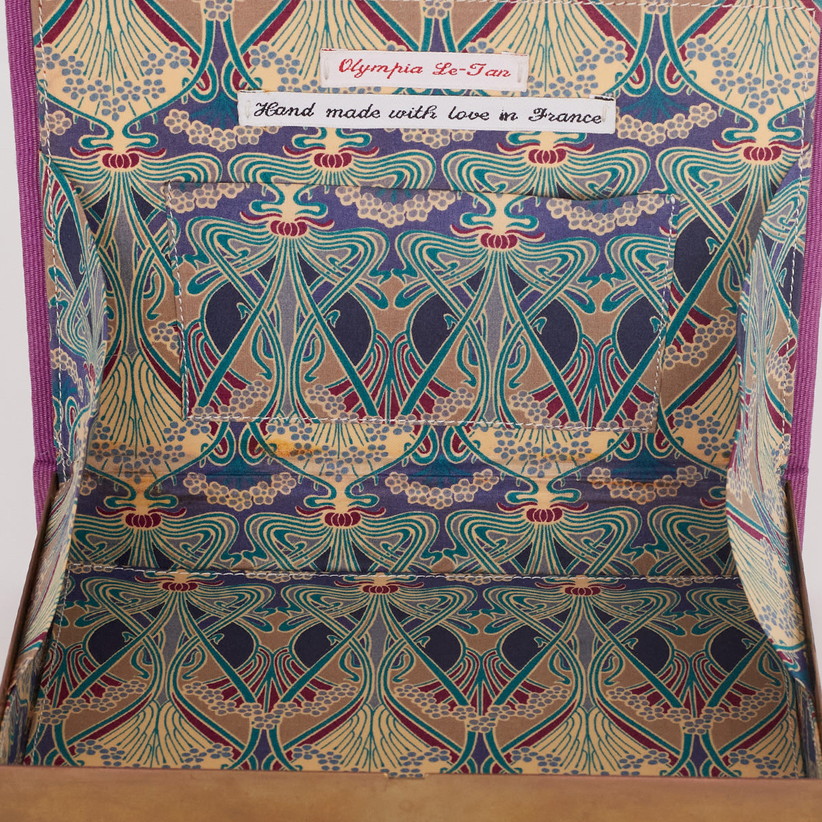 Detalhes: Clutch Olimpia Le Tan confeccionada em metal e tecido na cor roxa. O modelo possui formato de livro, bordado frontal, LT gravado no metal, bordado em preto na parte posterior. Parte interna em tecido estampado, conta com compartimento único, um bolso e etiqueta com nome da marca. Fechamento por encaixe.