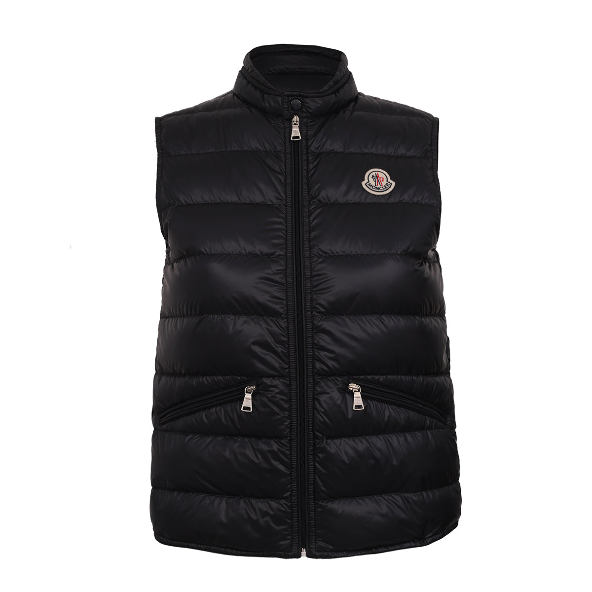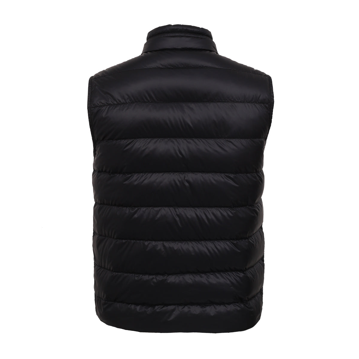 Detalhes: Colete Moncler Puffer confeccionado em poliamida na cor azul mariho. Modelo possui gola alta, sem mangas, comprimento curto, dois bolsos frontais com zíper, patch de logo no peito e botão esmaltado azul na gola. Fechamento em zíper e botão na gola.