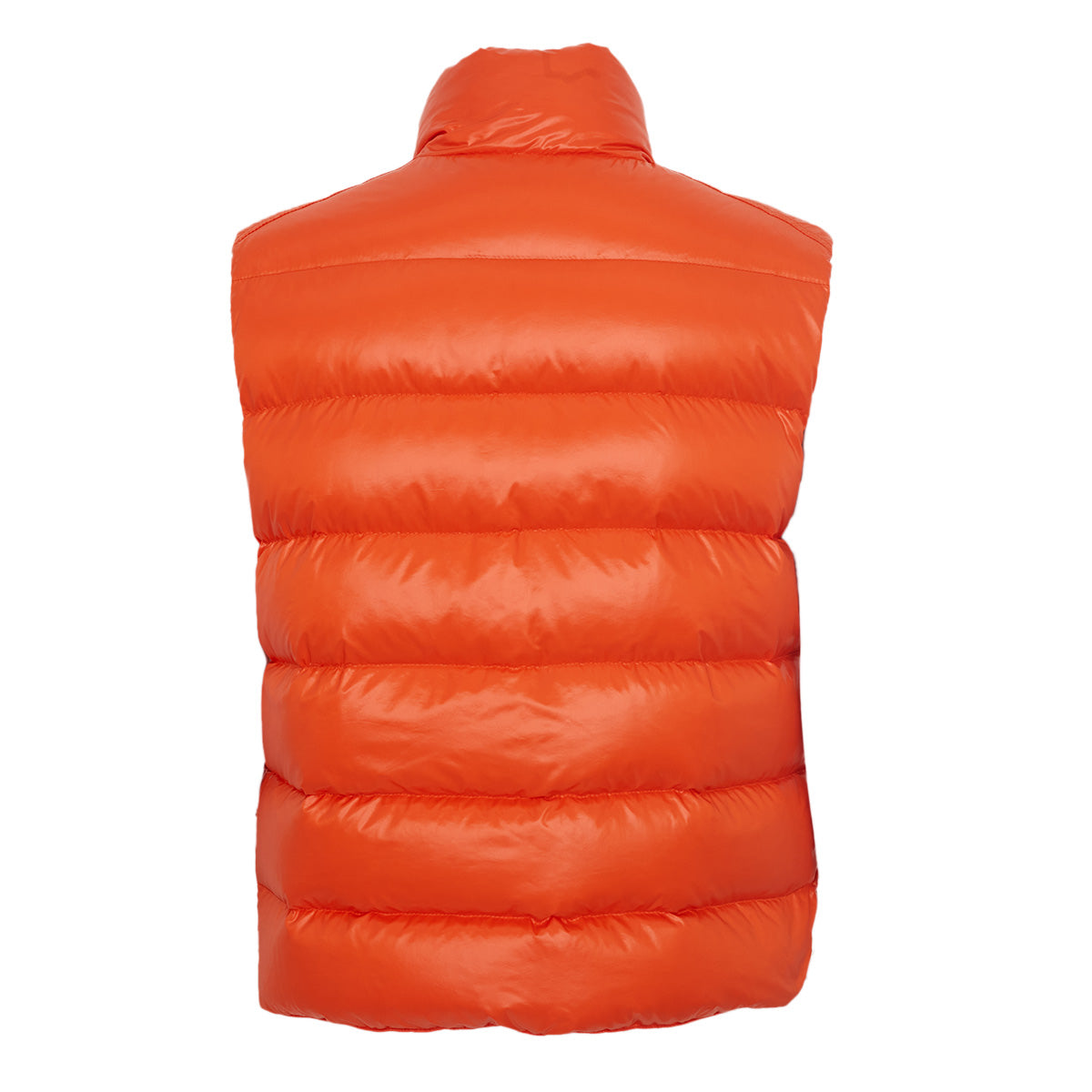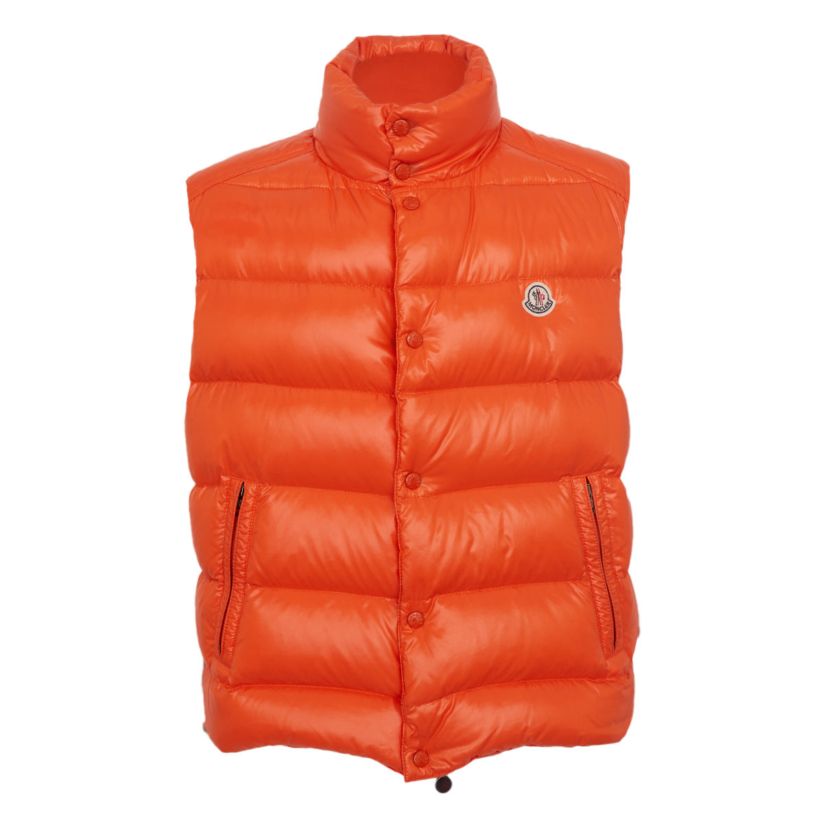 Detalhes: Colete Moncler Puffer confeccionado em tecido impermeável na cor laranja. Modelo possui textura matelassê, dois bolsos frontais, gola alta, patch de logo frontal e bolso interno com zíper. Fecho por zíper duplo e botão de pressão.