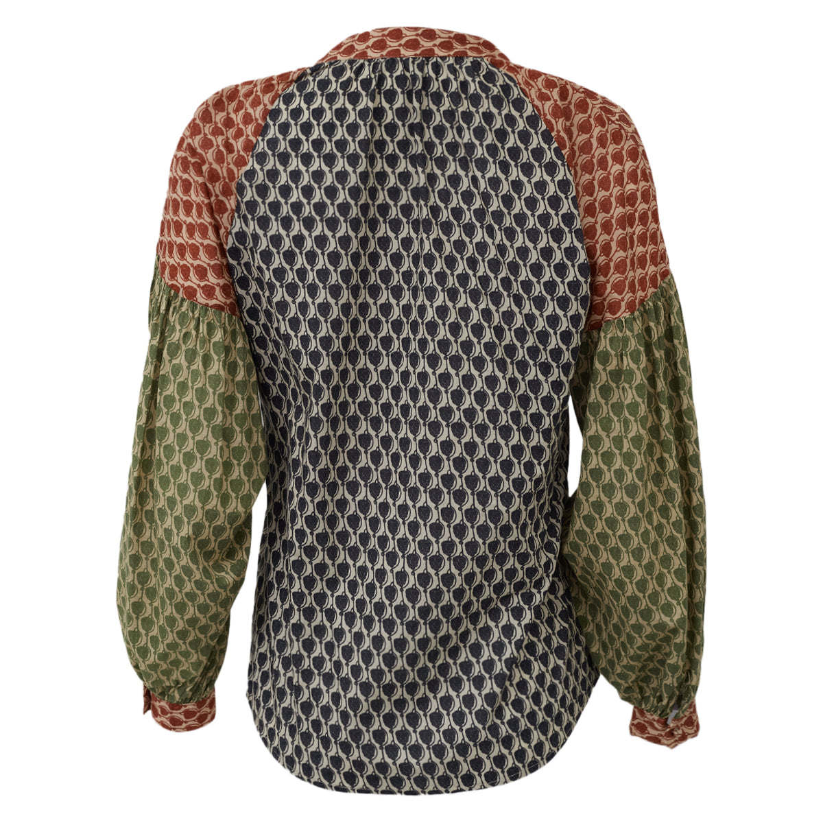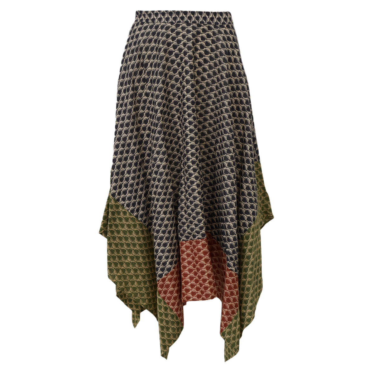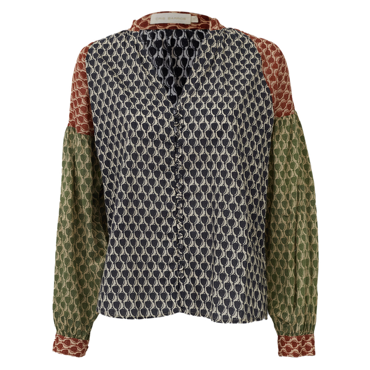 Detalhes: Conjunto Cris Barros confeccionado em tecido na cor branca com estampa nas cores verde, marrom e azul escuro. A blusa possui mangas longas, decote V, gola colarinho, e fecho por botões frontais. A saia possui comprimento longo, barra assimétrica e rodada, cós alto e fechamento por zíper lateral.