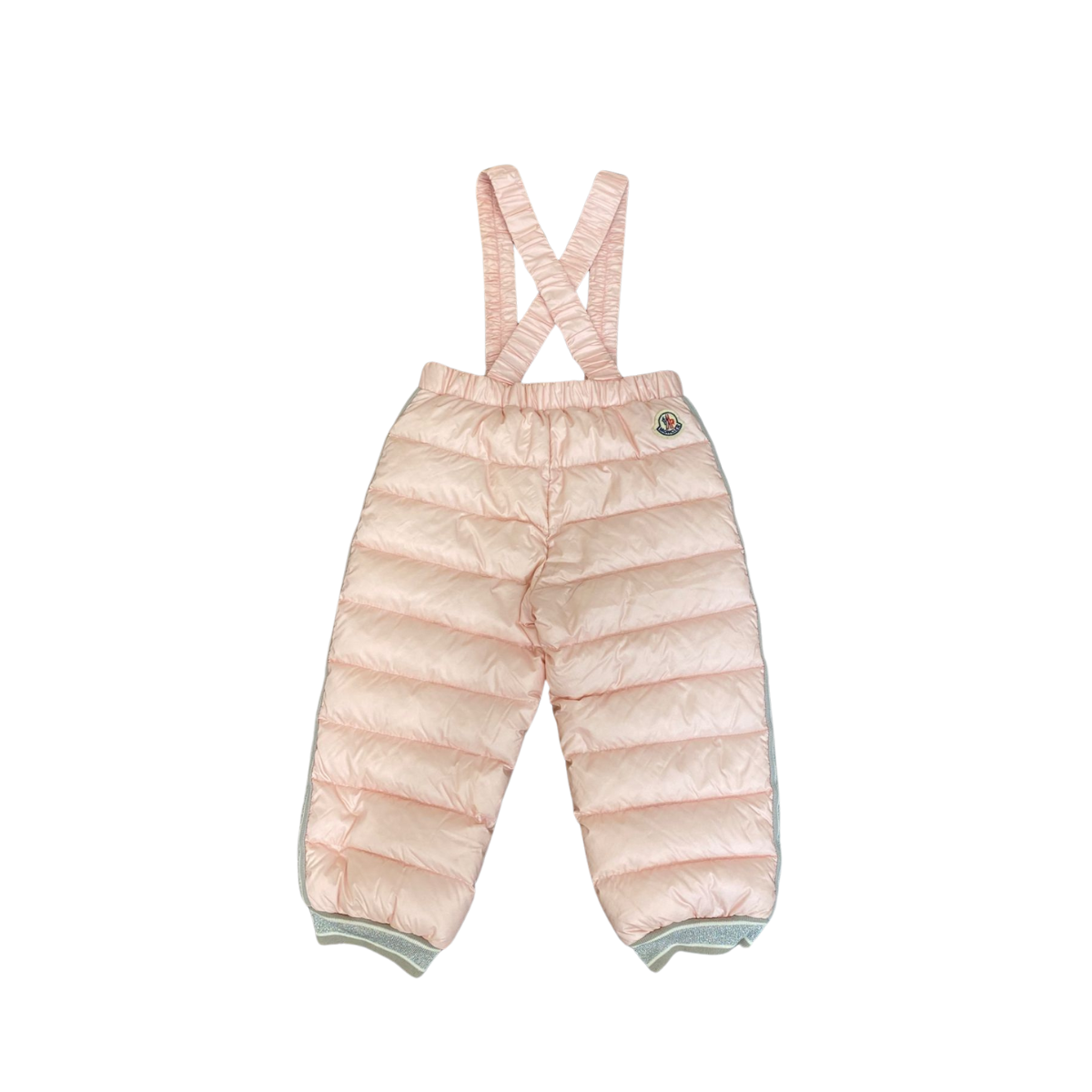 Detalhes: Conjunto Moncler Infantil composto por calça e jaqueta. A jaqueta possui modelo puffer, mangas longas, patch de logo, e detalhes em prata com brilhos nas laterais das mangas e nos punhos. Contém capuz e fechamento frontal em zíper. A calça possui elástico no cós, suspensórios, patch de logo e detalhes em prata nas laterais e no calcanhar.
