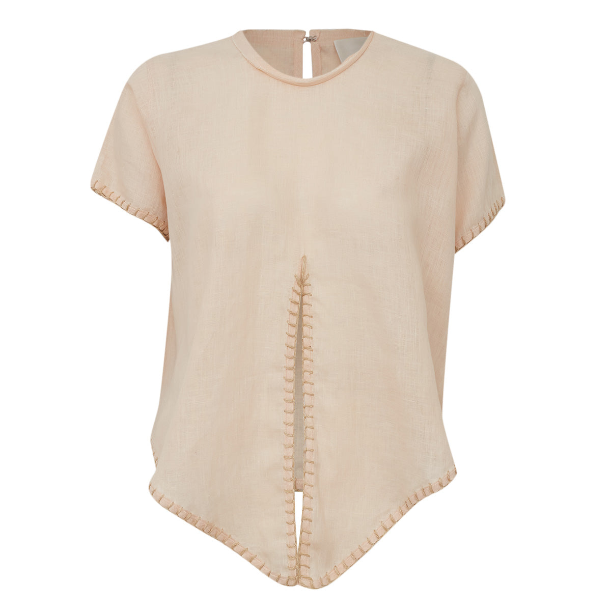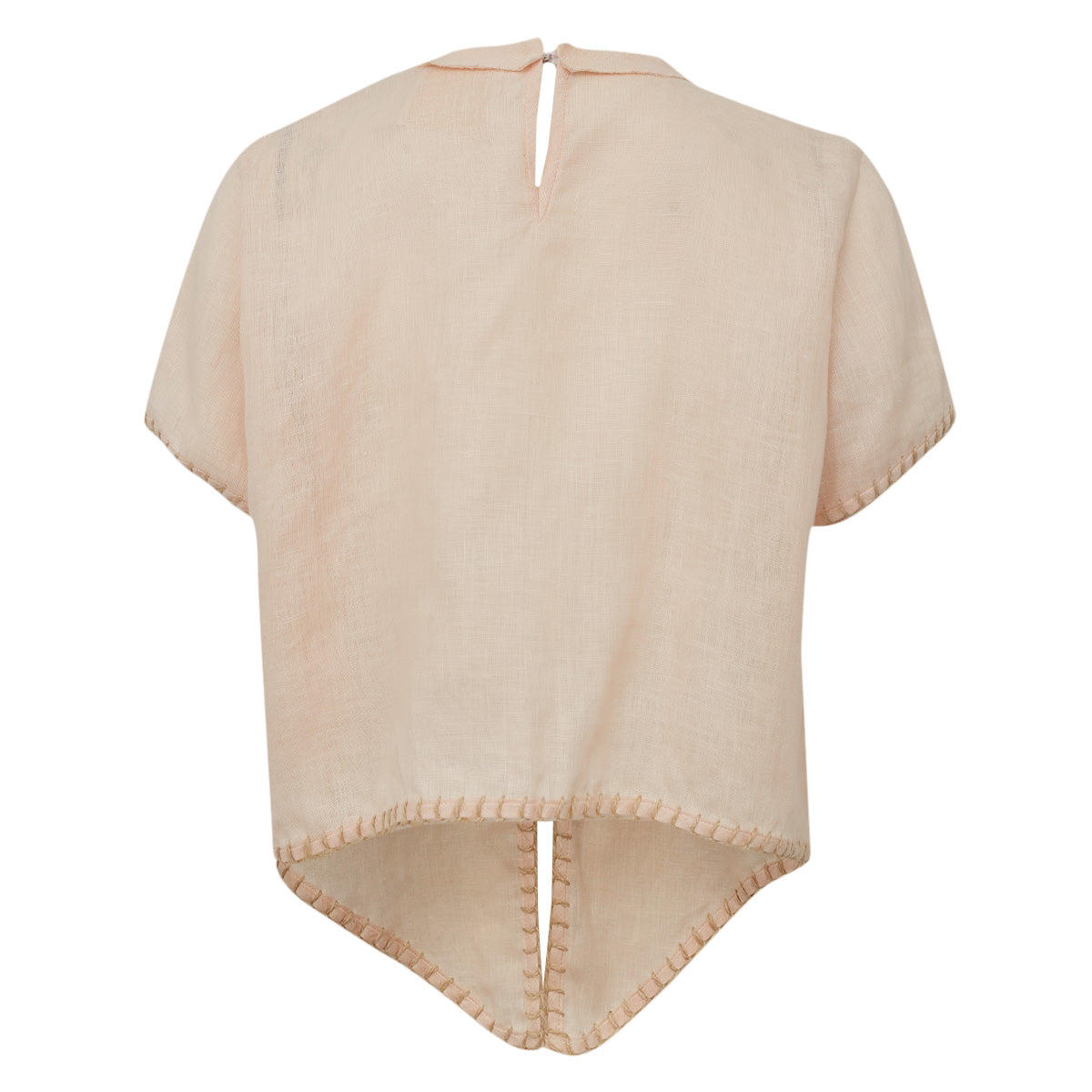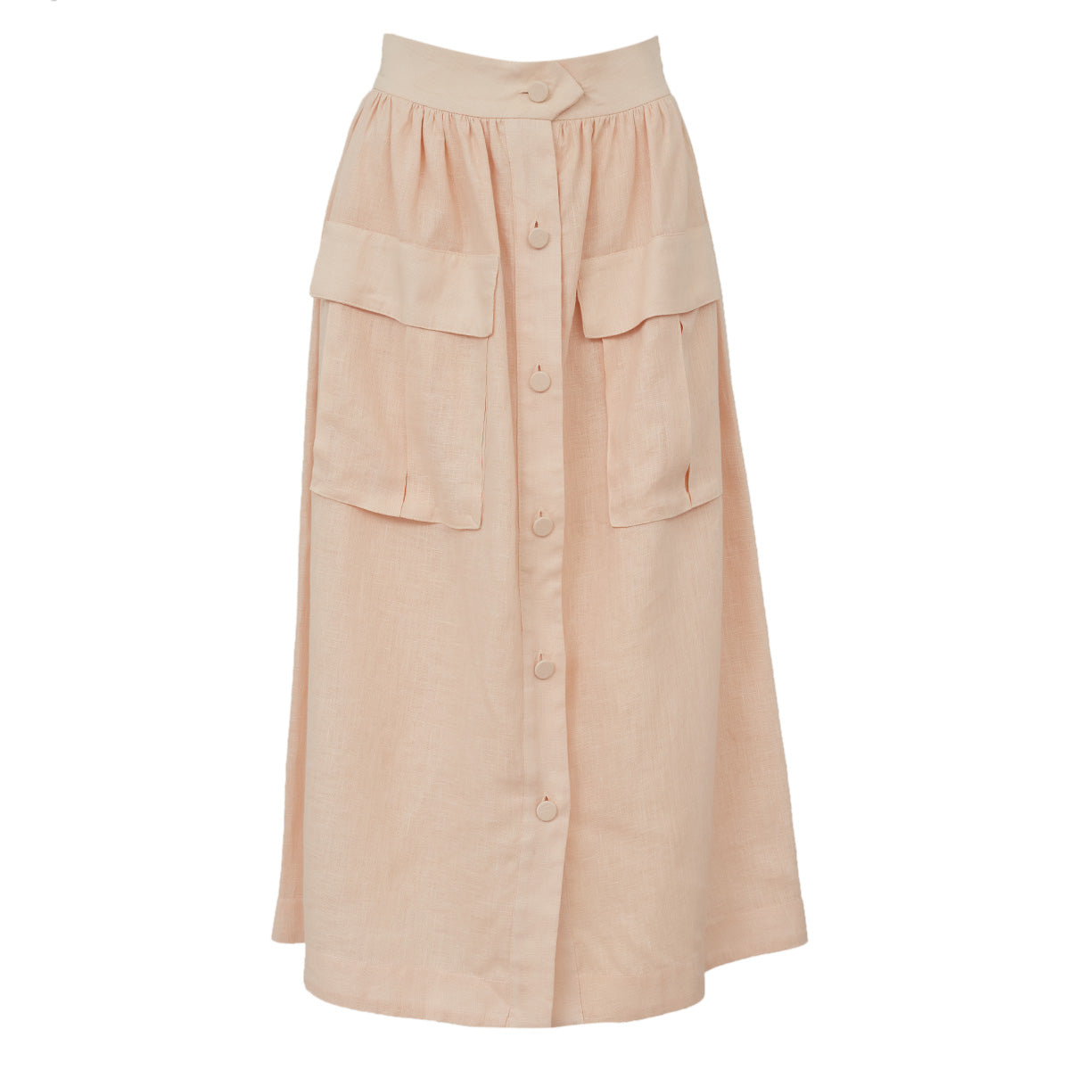 Detalhes: Conjunto Paula Raia confeccionado em linho na cor salmão. A blusa conta com mangas curtas, e amarração na parte frontal da peça . A saia possui modelagem solta, comprimento longo, cós alto, e dois bolsos na parte da frente. Fechamento em botões