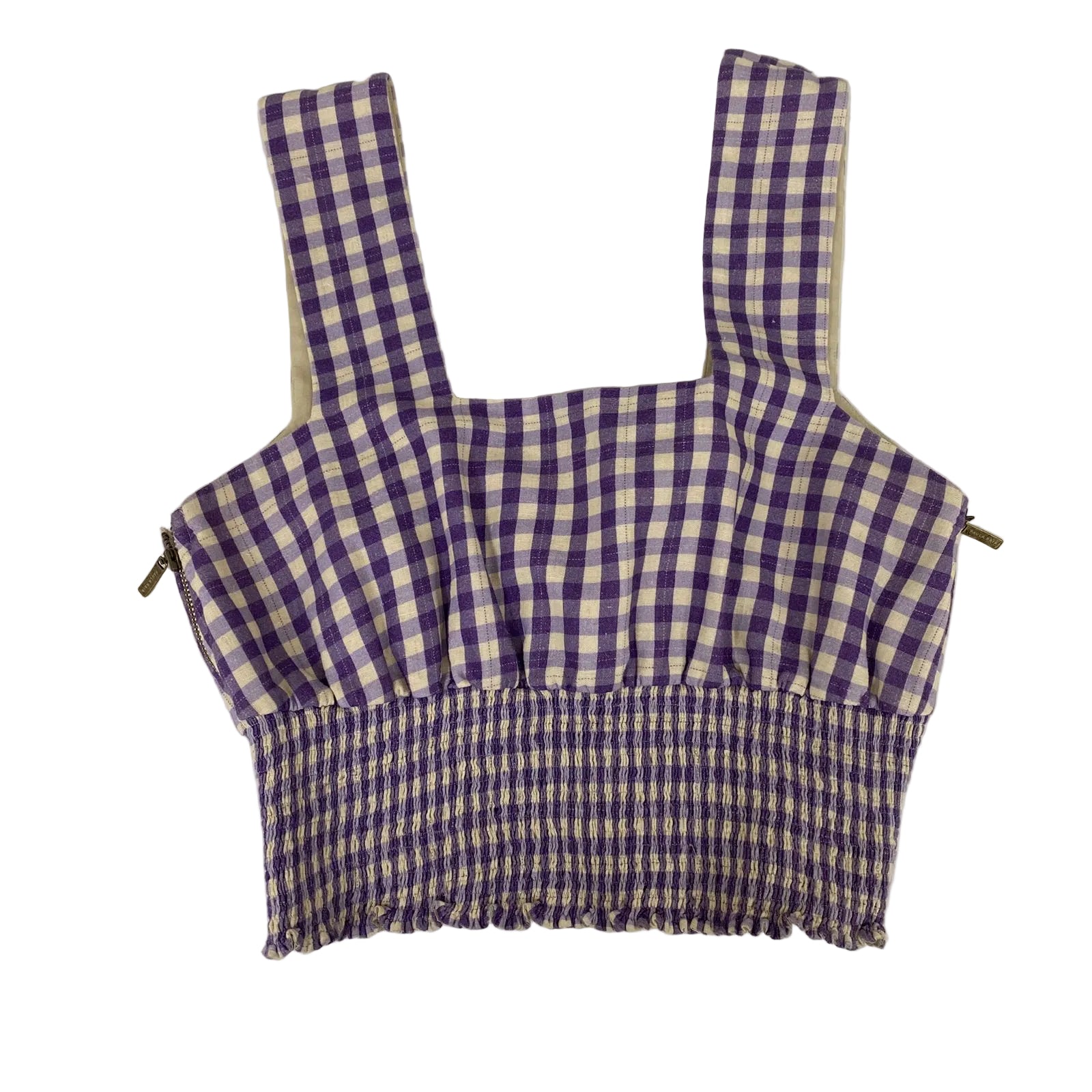 Detalhes: Conjunto Paula Raia confeccionado algodão e linho com estampa xadrez na cor bege e roxo, cropped com modelo de manga de alça e com calça. Calça possui fechamento por botões na parte frontal e o cropped por dois zipers laterais.